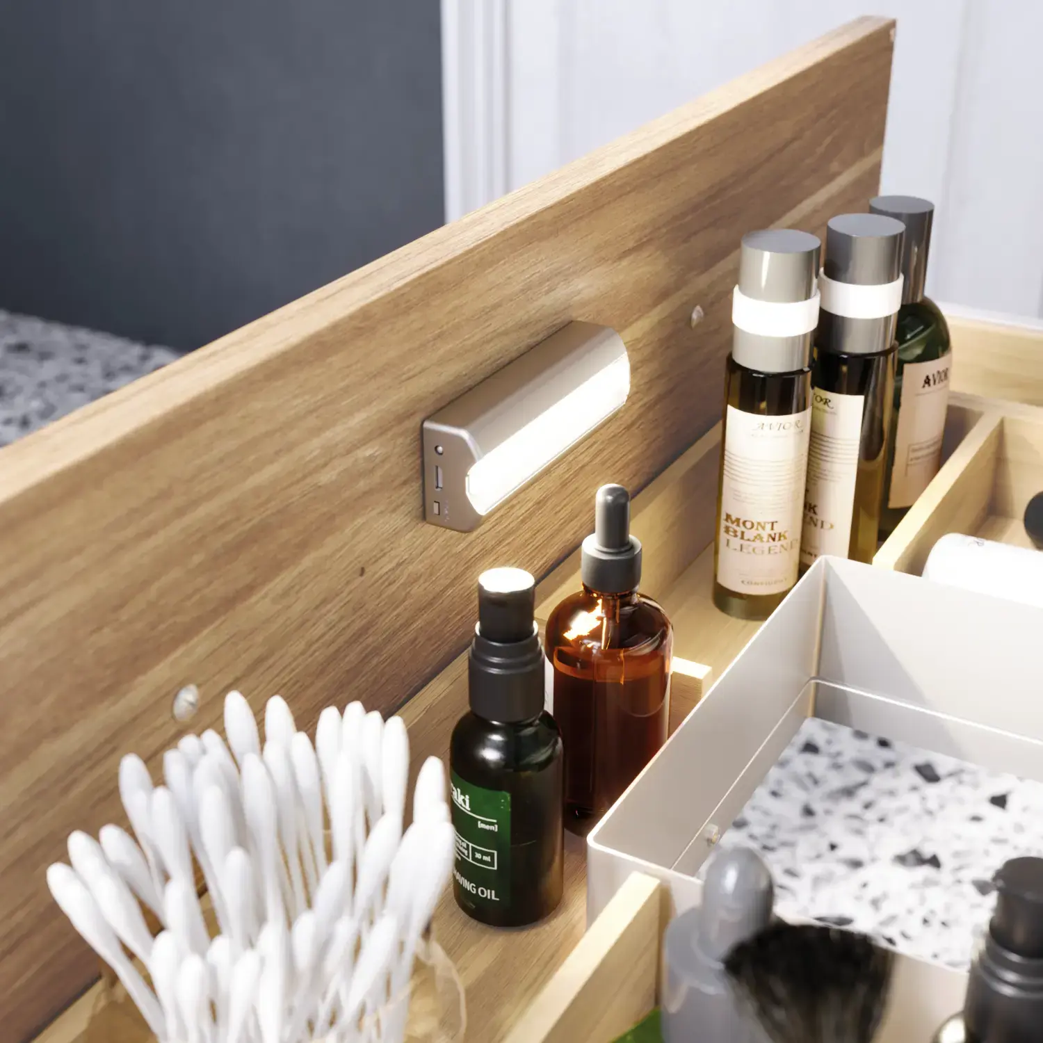 - Integroidut pistorasiat: Joissakin sarjoissa on laatikkoon valmiiksi asennettu pistorasia, jotta parranajokone tai sähköhammasharja voi olla aina käsillä käyttövalmiina ja sinun on helpompi suorittaa päivittäisiä hoitorutiineja ja säilöä ne helposti, kun ne eivät ole käytössä.