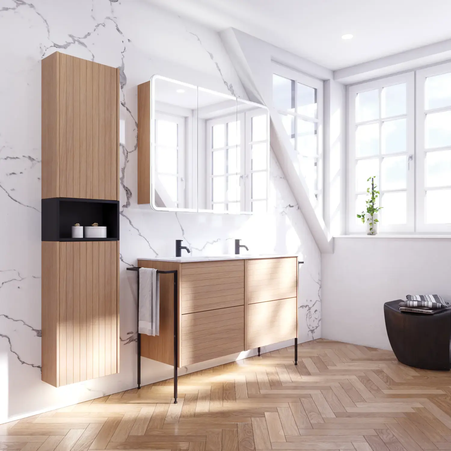 Suurelle perheelle tai paljon omaa tilaa toivovalle on tarjolla ainutlaatuinan posliininen kaksoisallas. Se on ihanteellinen kaksoisallasratkaisu uuteen kylpyhuoneeseen. Laatikoita ja kaappeja on saatavilla eri väreissä ja pintaan voi valita niin minimalistisia sävyjä kuin tunnelmallisen puukuvioinnin. Kaikissa laatikoissa on tilankäyttöä optimoivat kätevät tarjottimet sekä sisäänrakennetut vaimentimet, joiden ansiosta laatikot sulkeutuvat pehmeästi.