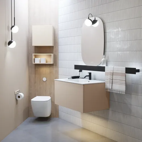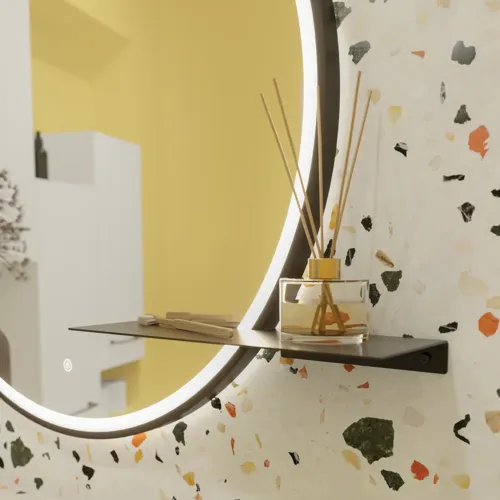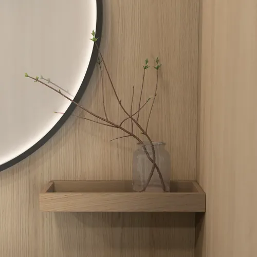 Kalusteiden kanssa samanväristen hyllyjen avulla voit antaa tilaa koriste-esineille ja luoda oman persoonallisen kylpyhuoneesi. Hyllyjen ripustimet on piilotettu, minkä ansiosta ne ikään kuin leijuvat seinällä. Hyllyt ovat hyvä ratkaisu myös, jos tarvitset tilaa pienesineille, joita tarvitset usein esim. peilin lähellä.