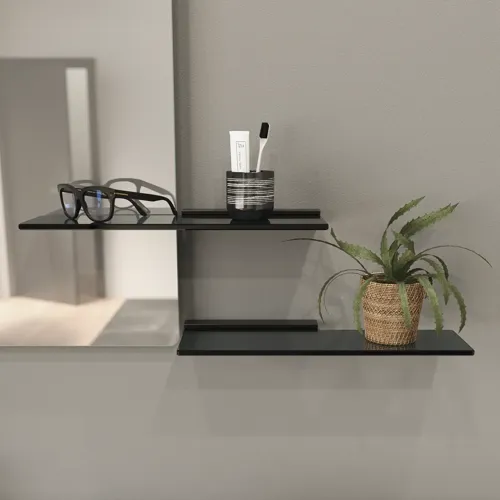 Illumi-hylly, jossa on musta alumiinireuna ja tummat sävytetyt lasihyllyt sopii täydellisesti epäsymmetriseen sarjaan, jossa Illumi ulottuu yli kalusteen mittojen. Se on uutta ja inspiroivaa.
