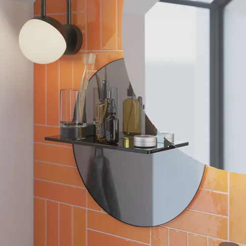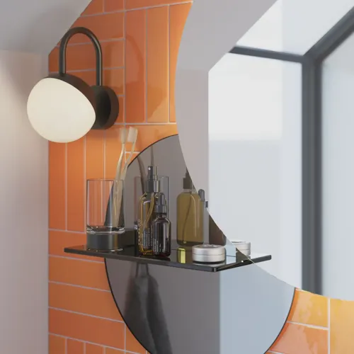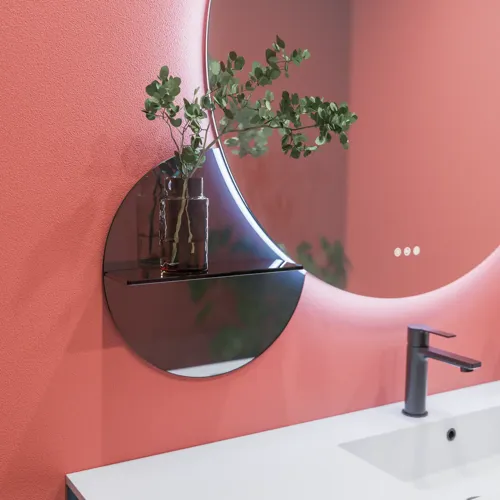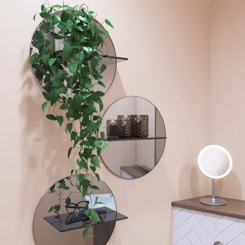 Luo tunnelmaa pienellä peilillä ja sen mukana tulevalla hyllyllä. Sävytetyt peilit ovat toinen nykytrendi.