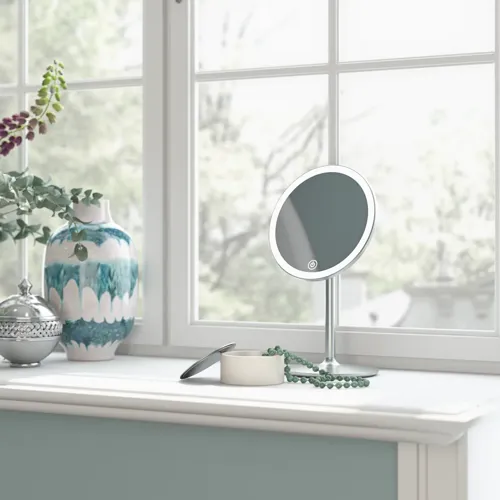Hienostuneen kätevä jalallinen peili näyttää kasvojesi kaikki yksityiskohdat lähietäisyydeltä, mistä on hyötyä meikkauksessa ja kauneudenhoidossa. Peilissä on sisäänrakennettu LED-valo ja viisinkertainen suurennus.