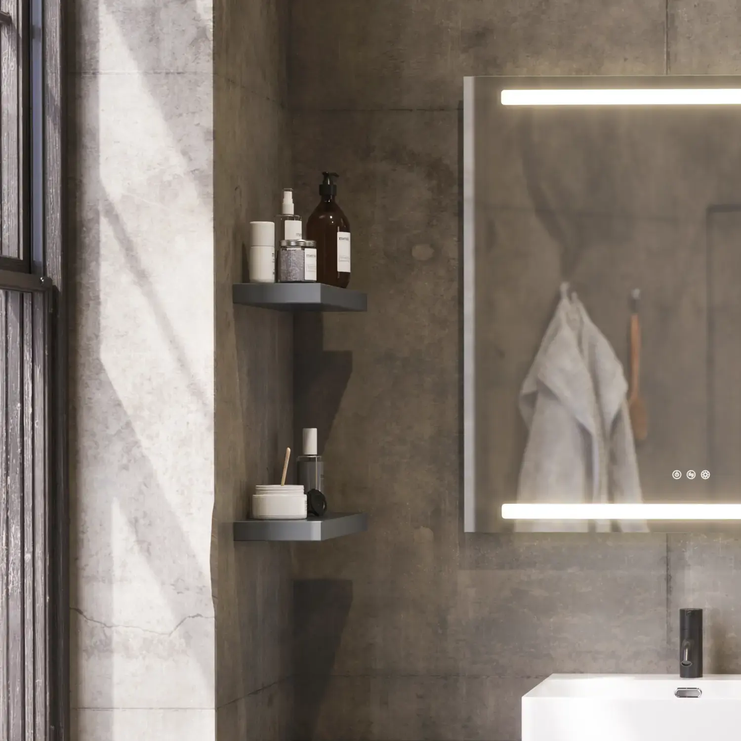 Näin älykästä ja yksinkertaista se voi olla - pieni tyylikäs metallihylly kelluu peilin edessä ja sopii täydellisesti tarvikkeiden säilytykseen.