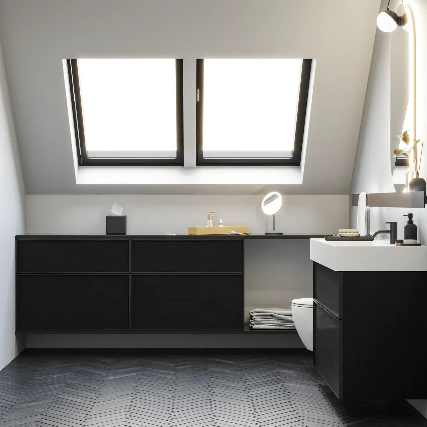 Luo rauhaa pienempään tilaan räätälöidyllä seinästä seinään -ratkaisulla: keksi luovia ratkaisuja vinokattojen alle ja harkitse esim. avointa penkkiä kuten tässä. Suuri peili tekee huoneesta suuremman, ja kaunis tasoallas pehmeine linjoineen tekee kylpyhuoneesta ainutlaatuisen kauniin.