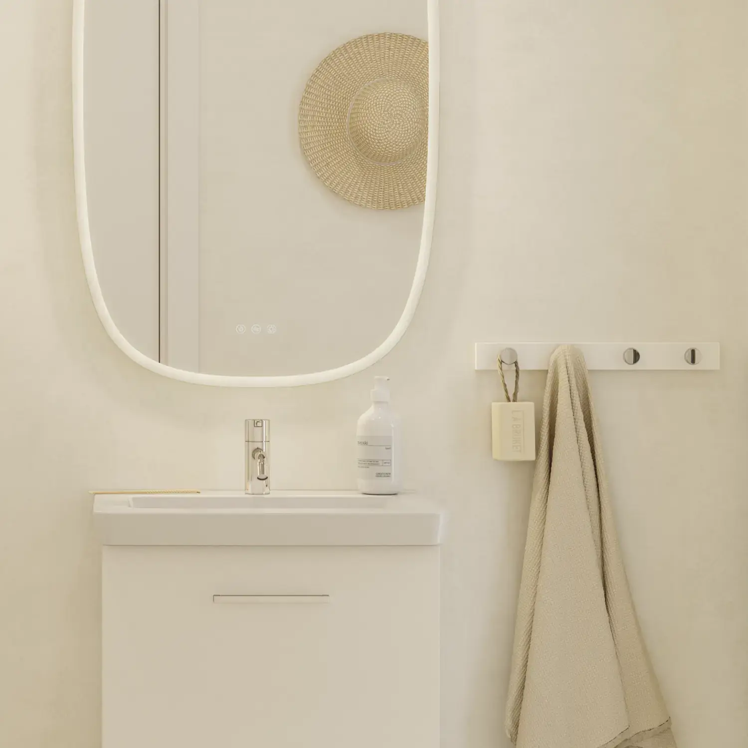 Huomaa kätevät yläkaapit, jossa säilyvät niin hammasharjat kuin ihonhoitotuotteet ja jossa ne ovat aina käden ulottuvilla, mutta eivät ikävästi näkyvillä.