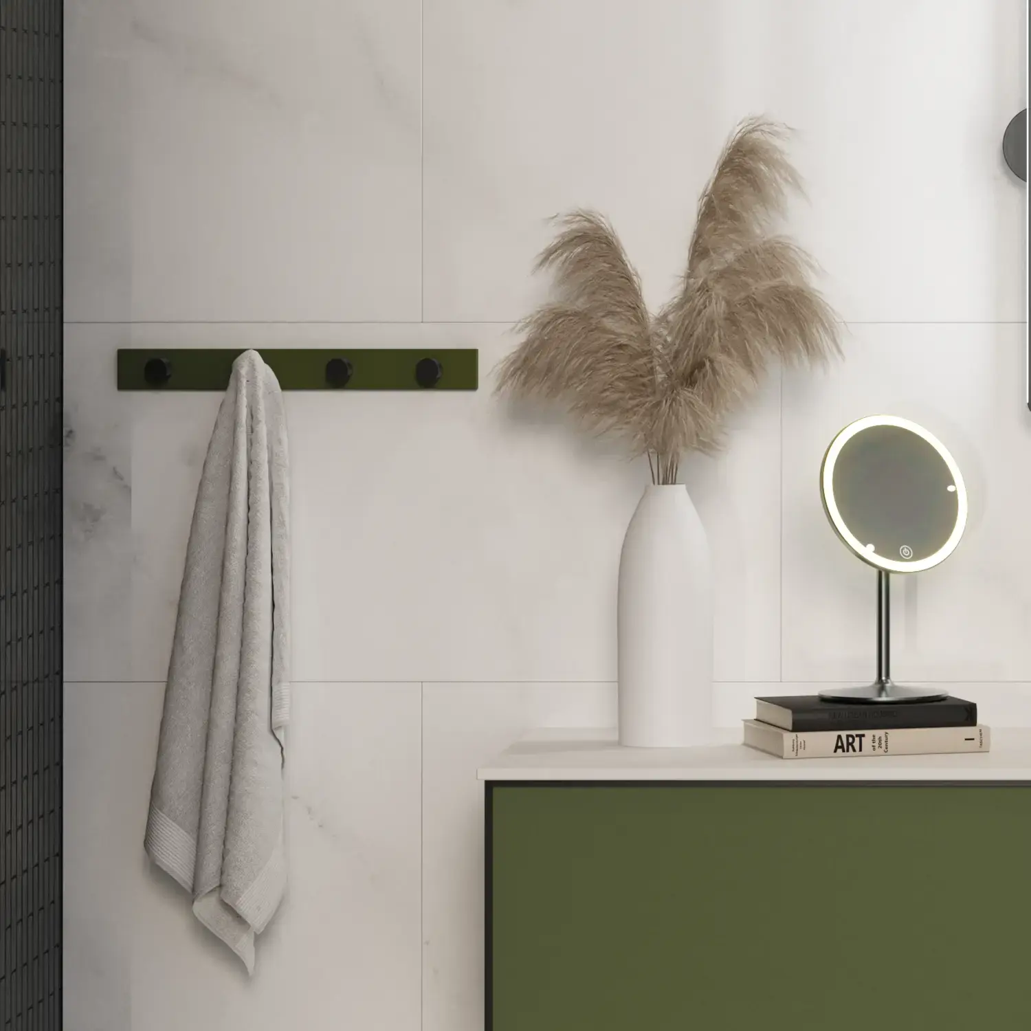 Dansani Luna Classic -sarjan klassisen vihreän ja kauniiden messinkisten yksityiskohtien yhdistelmä tekee kylpyhuoneesta ylellisen hyvinvoinnin keitaan. Kalusteet, allas ja pöytätaso muodostavat syvennykseen räätälöidyn kokonaisuuden.