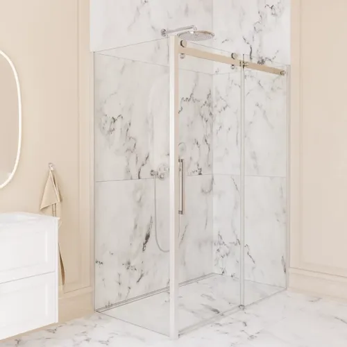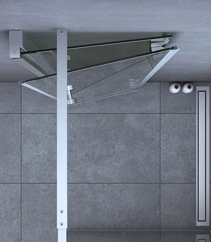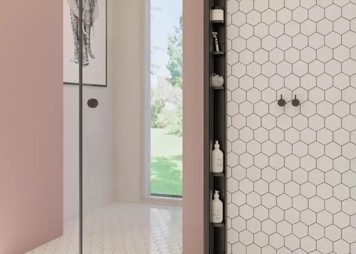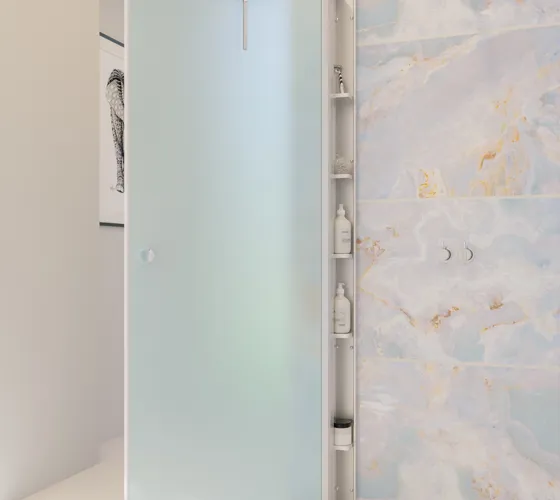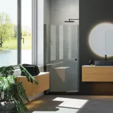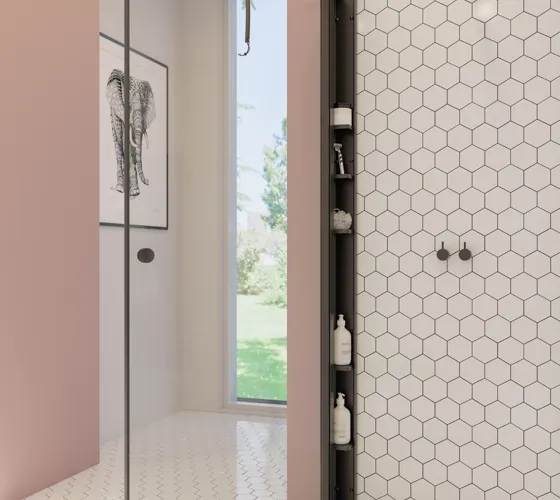 Voit hyödyntää tilan suihkunurkkaan saakka, kun valitset kääntöoven lyhyellä kiinteällä levikepaneelilla. Kun suihku ei ole käytössä, voit työntää oven sisäänpäin kalusteita kolhimatta ja saada lisää tilaa.