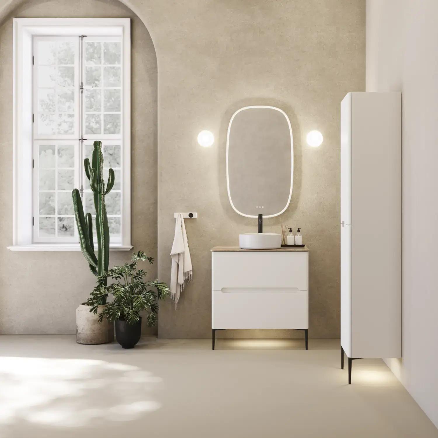 Kun on kyseessä uusi kylpyhuone on hyvä miettiä ensin, miten haluat hyödyntää huoneen tilaa. Jos haluat pitkän pöytätason, jossa on tilaa esimerkiksi vauvan hoitoalustalle, tilaa korkealle kaapille ja sivukaapeille on vähemmän esim. alusvaatteiden ja pyyhkeiden säilytystä varten. Tällöin voit valita erityiskorkean allaskaapin ja hyödyntää seinätilaa pesualtaan alla.