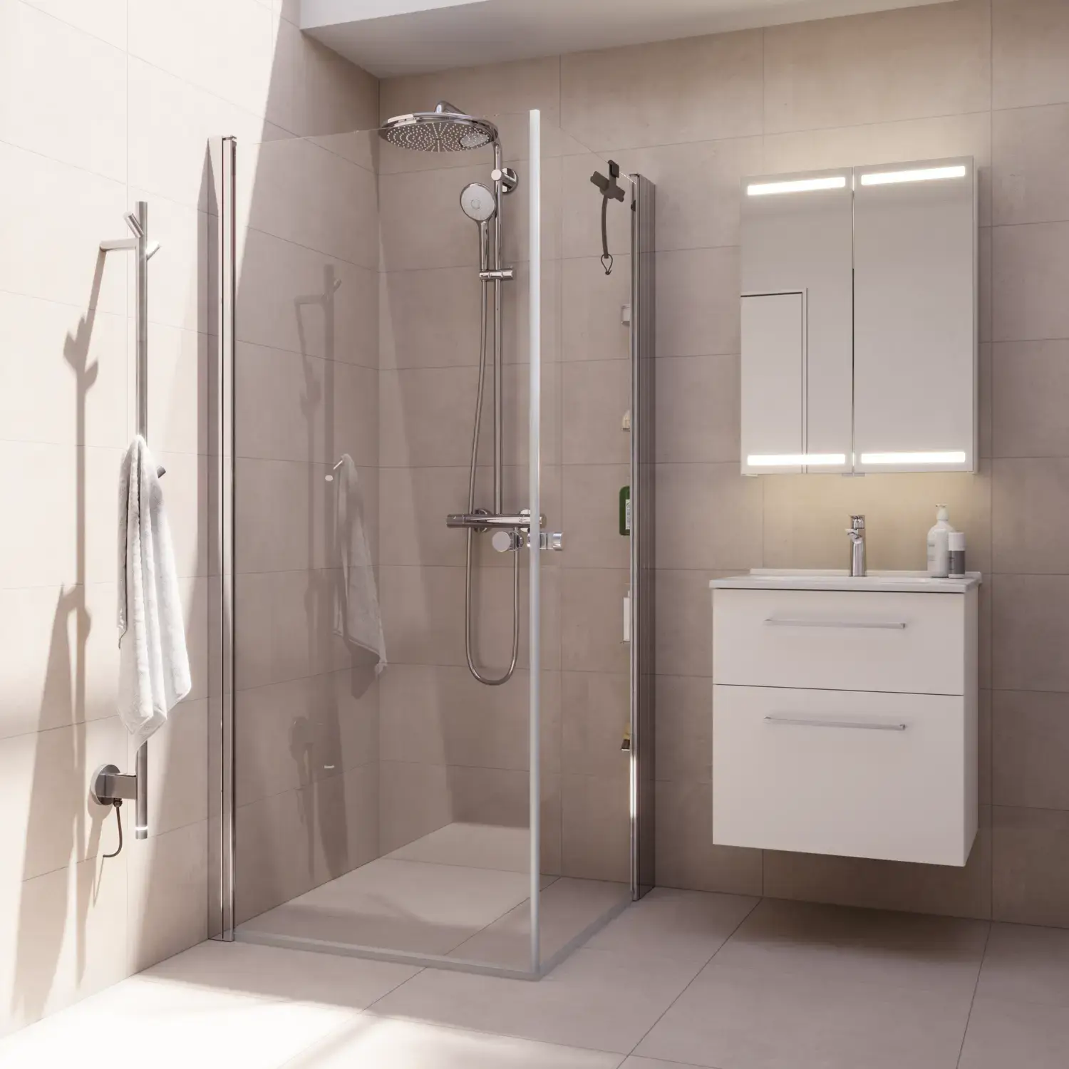 Kiiltävä kromi luo puhtaan ja ylellisen vaikutelman – ja sopii erityisen hyvin valoisiin tiloihin, joissa on lasia, peilejä ja muita metallisia yksityiskohtia. Yhdistä Match- tai XXL-suihkuseiniin kromilla, niin saat yhtenäisen ilmeen, jossa kaikki elementit sopivat yhteen.