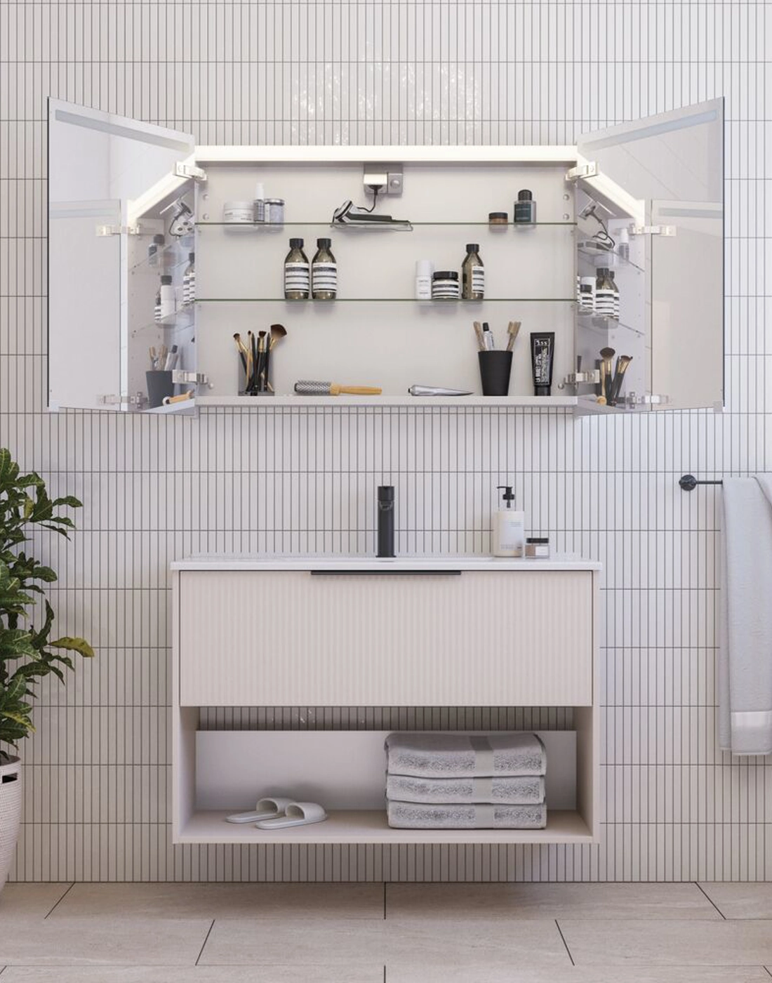Tässä turhamaisuuskaapissa yhdistyvät molempien maailmojen parhaat puolet: käytännöllinen laatikko, avoin tila, jossa voit esitellä lempiesi ja raidallinen etuosa, joka antaa ainutlaatuisen ja tyylikkään ilmeen. Valitse väreistä valkoinen, hiekkainen tai vaaleansininen löytääksesi kylpyhuoneeseesi parhaiten sopivan. Kahva on valmiiksi asennettu, joten se on käyttövalmis.