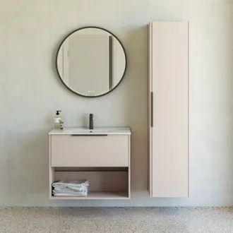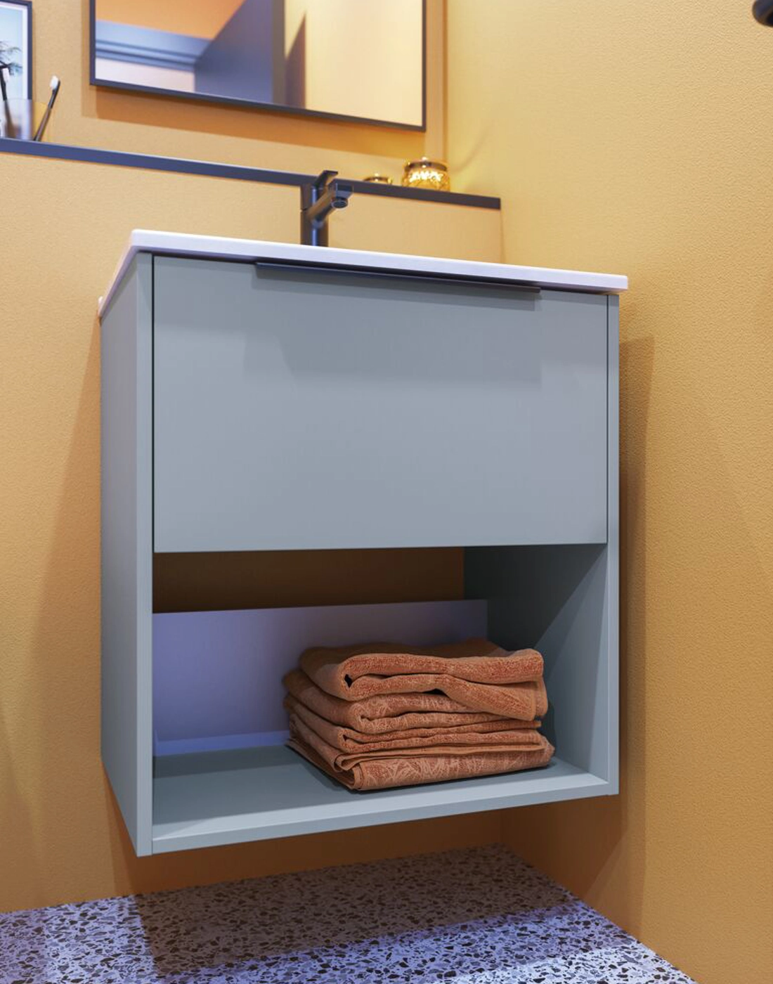 Tässä saat sekä säilytystilaa että mahdollisuuden näyttää suosikkiesineitäsi. Tässä turhamaisuuskaapissa on käytännöllinen laatikko ja avoin lokero, joka sopii erinomaisesti kauniiden pyyhkeiden tai koriste-esineiden esillepanoon. Saatavana kolmessa tyylikkäässä värissä: valkoinen, hiekkainen ja vaaleansininen. Laatikko on tilava ja siihen on kiinnitetty sopiva kahva, joten se on käyttövalmis.
