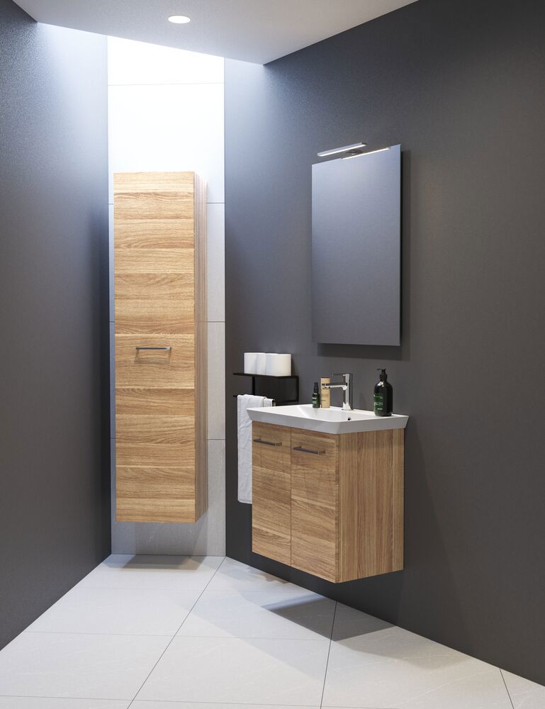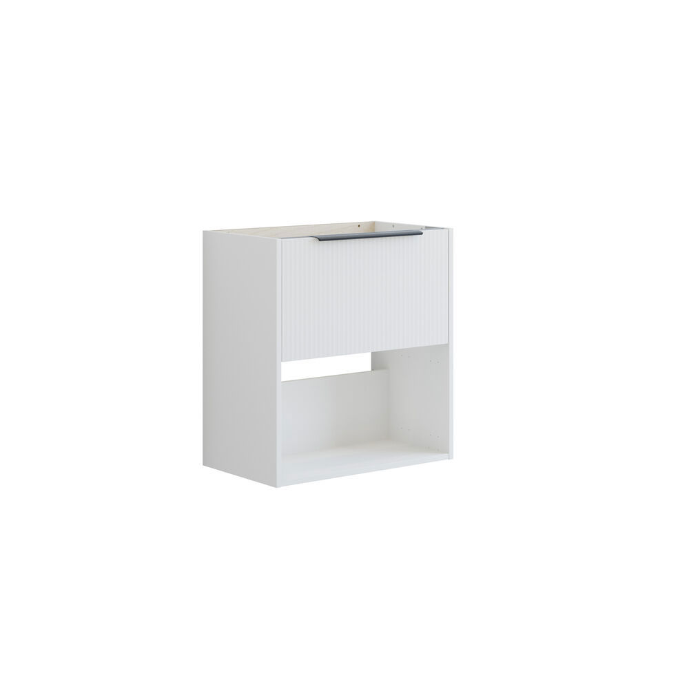 Tässä tyylikkäässä, yhdellä leveällä laatikolla varustetussa allaskaapissa yhdistyvät toiminnallisuus ja pohjoismainen tyylikkyys. Laatikko on tilava ja täysin ulosvedettävä, joten saat täydellisen yleiskuvan päivittäisistä tuotteistasi. Pehmeästi sulkeutuvat ja laadukkaat liukukiskot takaavat hiljaisen ja mukavan sulkeutumisen joka kerta. Mukana toimitettu musta kahva korostaa modernia ilmettä, ja raidallinen valkoinen mattapintainen pinta tuo kylpyhuoneeseen tekstuuria ja rauhallisen, hienostuneen ilmeen.