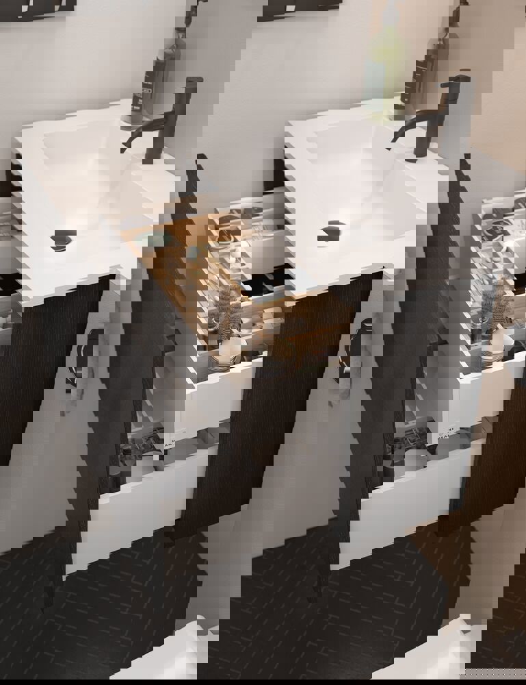 Rikastuta kylpyhuonettasi kauniilla yhdistelmällä eleganssia ja käytännöllisiä toimintoja tällä Dansani Calidris 1-laatikollisella allaskaapilla. Tämä minimalistisesti ja puhtailla linjoilla suunniteltu allaskaappi lisää hienostunutta estetiikkaa kylpyhuoneesi sisustukseen. 40 cm syvässä allaskaapissa on tilaa sekä tyylille että säilytystilalle. Tilavan laatikon avulla voit järjestää ja säilyttää kaikki kylpyhuoneen tarvikkeet tyylikkäästi. Tilava laatikko antaa sinulle mahdollisuuden järjestää ja säilyttää kaikki kylpyhuoneen tarvikkeet tyylikkäällä tavalla. Huomautus: Tammella ja valinnaisella värillä varustetuista tuotteista peritään käynnistysmaksu (BI1). Maksetaan kerran tammea ja valinnaista väriä kohti tuotteiden lukumäärästä riippumatta. Muista lisätä kylpyhuonekalusteisiisi pieniä käytännöllisiä asioita, joista nautit päivittäin. Esimerkiksi valot laatikoihin ja kaappeihin, sisäänrakennetut pistorasiat ja kalusteiden alla olevat himmennettävät tunnistinvalot, jotka ohjaavat yöllisiä kylpyhuonekäyntejä. Vaihtoehdot tilataan samaan aikaan kalusteiden kanssa.