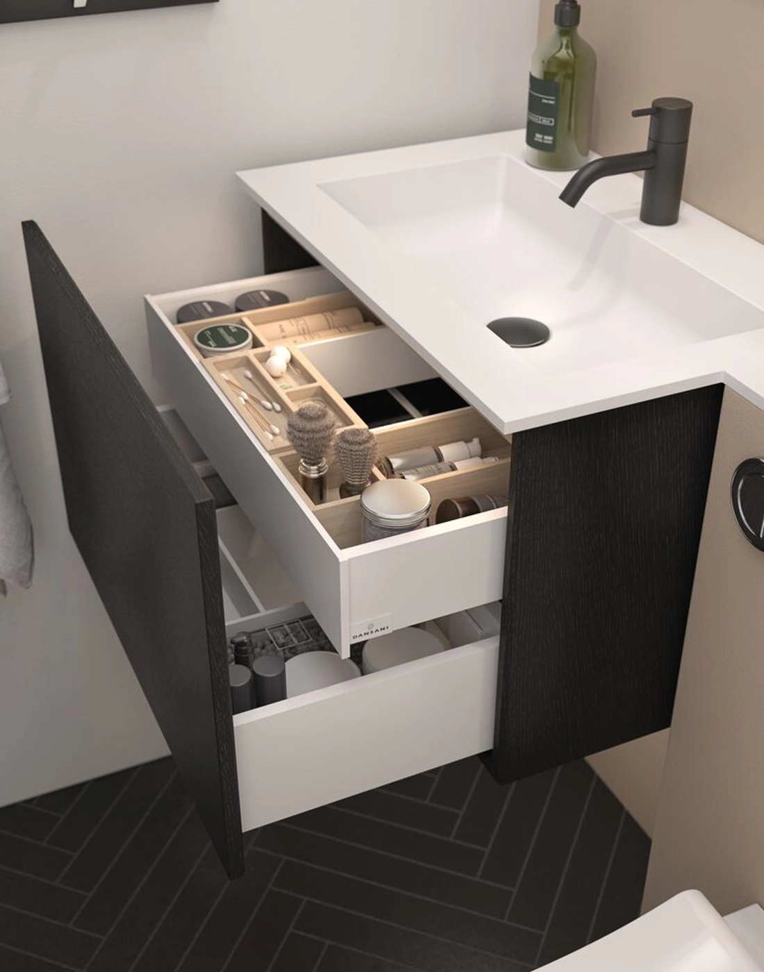 Rikastuta kylpyhuonettasi kauniilla yhdistelmällä eleganssia ja käytännöllisiä toimintoja tällä Dansani Calidris 1-laatikollisella allaskaapilla. Tämä minimalistisesti ja puhtailla linjoilla suunniteltu allaskaappi lisää hienostunutta estetiikkaa kylpyhuoneesi sisustukseen. 40 cm syvässä allaskaapissa on tilaa sekä tyylille että säilytystilalle. Tilavan laatikon avulla voit järjestää ja säilyttää kaikki kylpyhuoneen tarvikkeet tyylikkäästi. Tilava laatikko antaa sinulle mahdollisuuden järjestää ja säilyttää kaikki kylpyhuoneen tarvikkeet tyylikkäällä tavalla. Huomautus: Tammella ja valinnaisella värillä varustetuista tuotteista peritään käynnistysmaksu (BI1). Maksetaan kerran tammea ja valinnaista väriä kohti tuotteiden lukumäärästä riippumatta. Muista lisätä kylpyhuonekalusteisiisi pieniä käytännöllisiä asioita, joista nautit päivittäin. Esimerkiksi valot laatikoihin ja kaappeihin, sisäänrakennetut pistorasiat ja kalusteiden alla olevat himmennettävät tunnistinvalot, jotka ohjaavat yöllisiä kylpyhuonekäyntejä. Vaihtoehdot tilataan samaan aikaan kalusteiden kanssa.