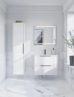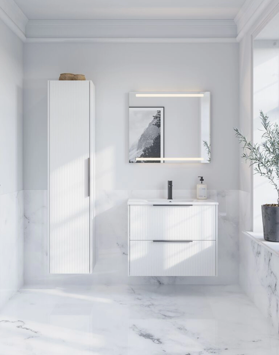 Tämässä turhamaisuuskaapissa yhdistyvät toiminnallisuus ja tyyli, sillä siinä on 2 tilavaa laatikkoa ja tyylikäs raidallinen etuosa. Saatavana valkoisena, hiekanvärisenä tai vaaleansinisenä, tämä kaappi antaa kylpyhuoneellesi modernin ja ainutlaatuisen ilmeen. Laatikot tarjoavat runsaasti säilytystilaa, ja kahvat on asennettu ja käyttövalmiina.