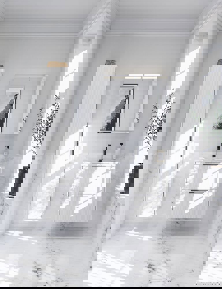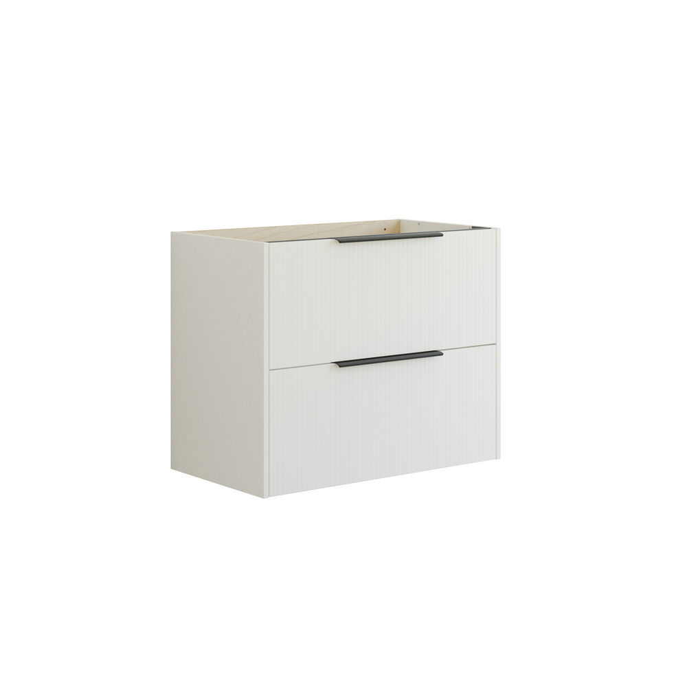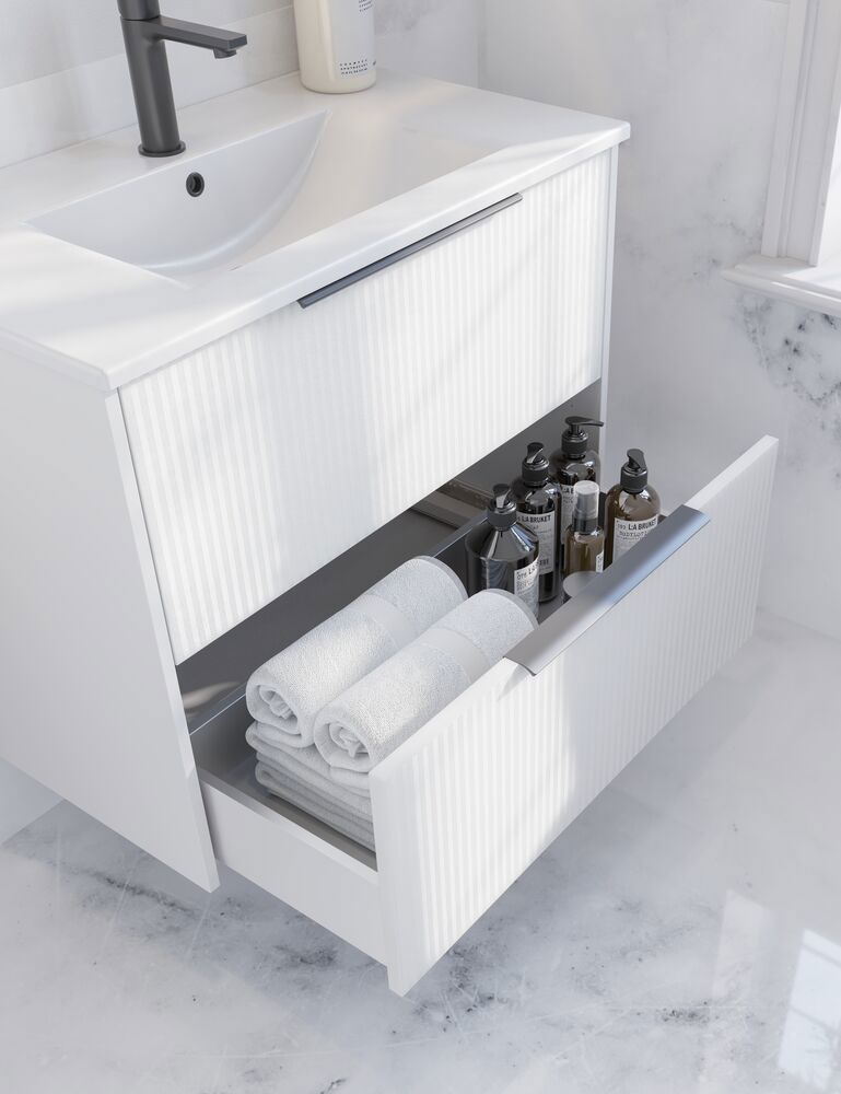 Tämässä turhamaisuuskaapissa yhdistyvät toiminnallisuus ja tyyli, sillä siinä on 2 tilavaa laatikkoa ja tyylikäs raidallinen etuosa. Saatavana valkoisena, hiekanvärisenä tai vaaleansinisenä, tämä kaappi antaa kylpyhuoneellesi modernin ja ainutlaatuisen ilmeen. Laatikot tarjoavat runsaasti säilytystilaa, ja kahvat on asennettu ja käyttövalmiina.