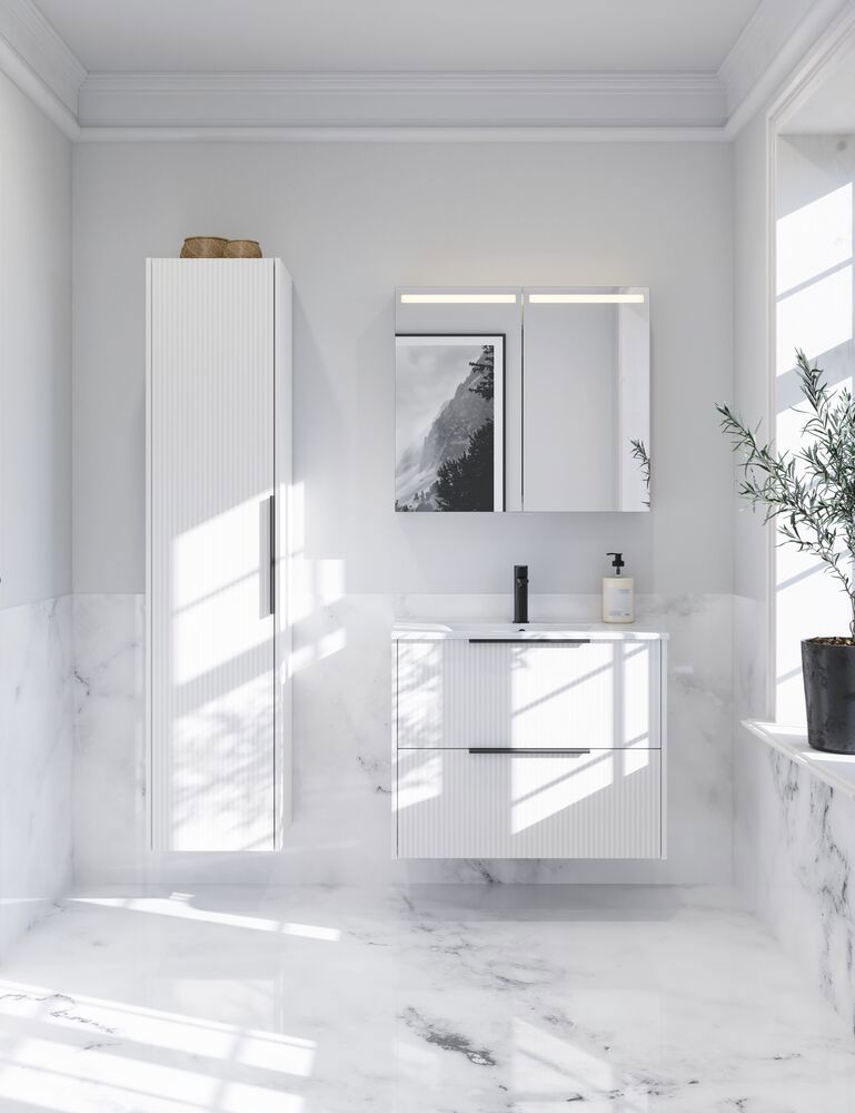 Tämässä turhamaisuuskaapissa yhdistyvät toiminnallisuus ja tyyli, sillä siinä on 2 tilavaa laatikkoa ja tyylikäs raidallinen etuosa. Saatavana valkoisena, hiekanvärisenä tai vaaleansinisenä, tämä kaappi antaa kylpyhuoneellesi modernin ja ainutlaatuisen ilmeen. Laatikot tarjoavat runsaasti säilytystilaa, ja kahvat on asennettu ja käyttövalmiina.