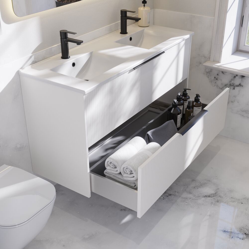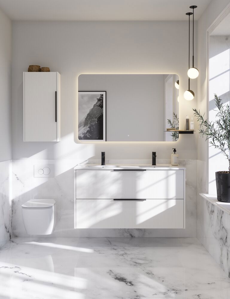 Tämässä turhamaisuuskaapissa yhdistyvät toiminnallisuus ja tyyli, sillä siinä on 2 tilavaa laatikkoa ja tyylikäs raidallinen etuosa. Saatavana valkoisena, hiekanvärisenä tai vaaleansinisenä, tämä kaappi antaa kylpyhuoneellesi modernin ja ainutlaatuisen ilmeen. Laatikot tarjoavat runsaasti säilytystilaa, ja kahvat on asennettu ja käyttövalmiina.