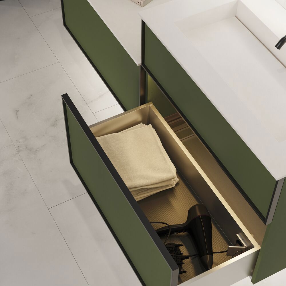 Päivitä kylpyhuoneesi allaskaapilla, jossa on 2 laatikkoa. Tämä tyylikäs kaappi on 64 cm korkea ja 44 cm syvä, mikä on ihanteellinen kylpyhuonetarvikkeidesi järjestämiseen. Elegantti musta kehys laatikoiden ympärillä lisää modernia ja tyylikästä ilmettä, joka sopii mihin tahansa sisustukseen. Valitse eri väreistä löytääksesi parhaan vaihtoehdon omaan tyyliisi. Tämä allaskaappi tekee kylpyhuonetarvikkeidesi järjestämisestä helppoa ja kaiken siistinä pitämisestä vaivatonta. Allaskaappi, jossa on 2 laatikkoa, yhdistää käytännöllisen toimivuuden kauniiseen muotoiluun, mikä tekee siitä täydellisen lisän kylpyhuoneeseesi. Tee tilastasi järjestelmällisempi ja kutsuvampi tämän upean allaskaapin avulla. Huomautus: Valinnaisen värin sisältävistä tuotteista peritään käynnistysmaksu (BI1). Se maksetaan kerran valinnaisväriä kohden tuotteiden lukumäärästä riippumatta. Muista lisätä kylpyhuonekalusteisiisi pieniä käytännöllisiä asioita, joista nautit päivittäin. Esimerkiksi valot laatikoihin ja kaappeihin, sisäänrakennetut pistorasiat ja kalusteiden alla olevat himmennettävät tunnistinvalot, jotka ohjaavat yöllisiä kylpyhuonekäyntejä. Vaihtoehdot tilataan samaan aikaan kalusteiden kanssa.