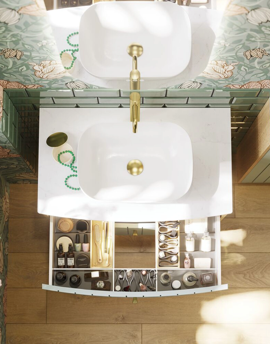 2-laatikolliset allaskaapit tarjoavat viehättävää retromuotoilua kylpyhuoneeseesi. Kaarevissa etuosissa on kauniit urat, jotka luovat persoonallisen ilmeen. Kaappeja on saatavana useissa eri väreissä, joten voit valita henkilökohtaiseen tyyliisi parhaiten sopivan värin. Kauniin ulkonäkönsä lisäksi kaapit ovat myös käytännöllisiä, sillä niissä on kaksi tilavaa laatikkoa, joissa voit säilyttää välttämättömät tarvikkeesi. Lisää kylpyhuoneeseesi ajatonta tyylikkyyttä allaskaapeilla ja nauti niiden tilaan tuomasta ainutlaatuisesta kosketuksesta. Huomautus: Valinnaisen värin sisältävistä tuotteista peritään käynnistysmaksu (BI1). Se maksetaan kerran valinnaisväriä kohden tuotteiden lukumäärästä riippumatta. Muista lisätä kylpyhuonekalusteisiisi pieniä käytännöllisiä asioita, joista nautit päivittäin. Esimerkiksi valot laatikoihin ja kaappeihin, sisäänrakennetut pistorasiat ja kalusteiden alla olevat himmennettävät tunnistinvalot, jotka ohjaavat yöllisiä kylpyhuonekäyntejä. Vaihtoehdot tilataan samaan aikaan kalusteiden kanssa.