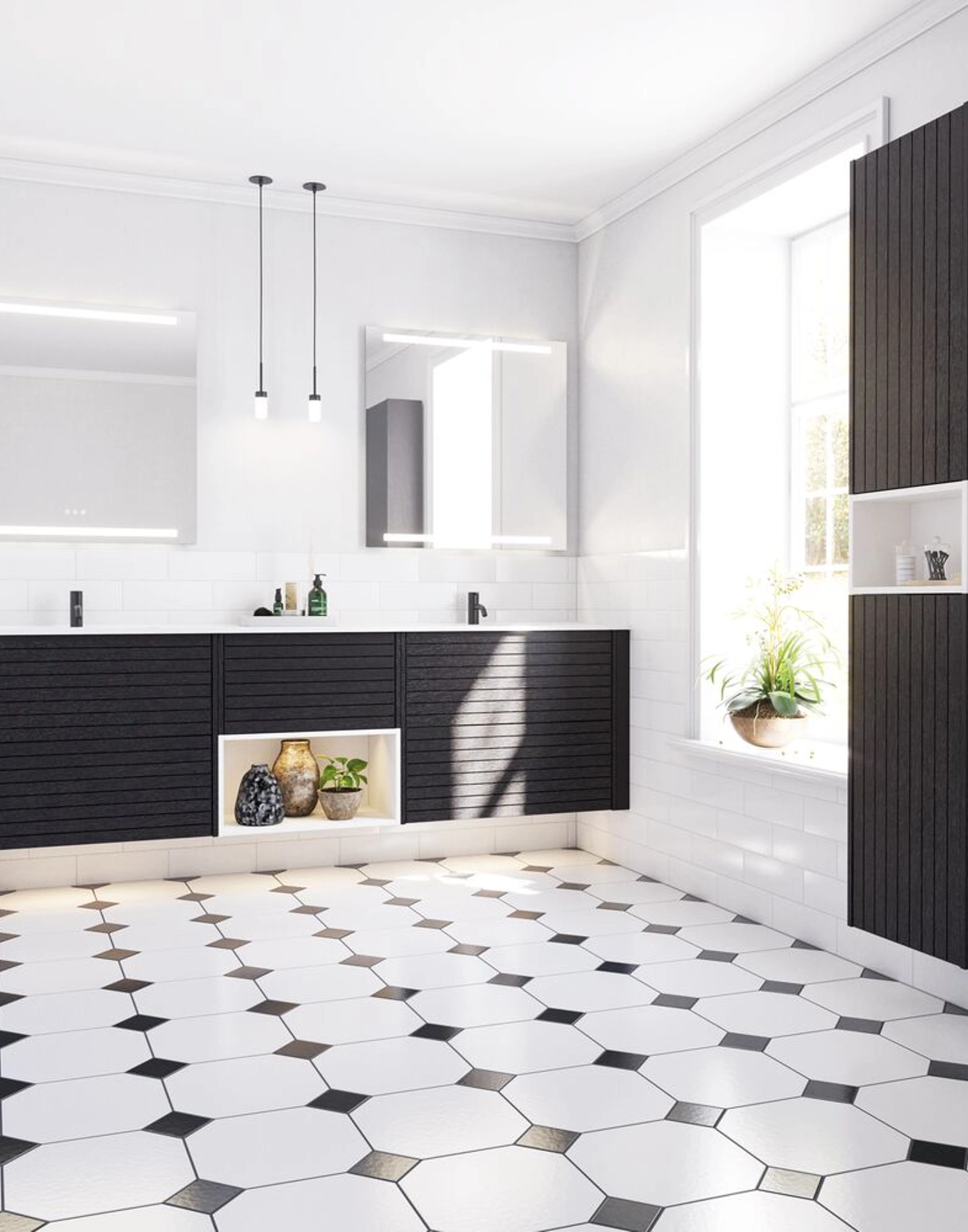 Luo ainutlaatuinen tyyli kylpyhuoneeseesi allaskaapeilla, joissa on uritettu etuosa. Kahdella 32 cm korkealla laatikolla saat optimaalisen säilytystilan kylpyhuonetarvikkeillesi. Uritettu etuosa tuo erottuvan ja modernin ilmeen, joka korostaa kylpyhuoneen persoonallisuutta. Tämä kaappi yhdistää käytännöllisyyden ja estetiikan, mikä tekee siitä ihanteellisen ratkaisun niille, jotka haluavat kylpyhuoneestaan sekä käytännöllisen että tyylikkään. Muista lisätä kylpyhuonekalusteisiisi pieniä käytännöllisiä asioita, joista nautit päivittäin. Esimerkiksi valot laatikoihin ja kaappeihin, sisäänrakennetut pistorasiat ja kalusteiden alla olevat himmennettävät tunnistinvalot, jotka ohjaavat yöllisiä kylpyhuonekäyntejä. Vaihtoehdot tilataan samaan aikaan kalusteiden kanssa.