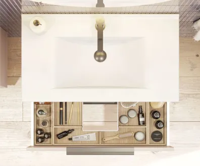 Tuplaa säilytystilaa tällä turhamaisuusyksiköllä, jossa on 2 tilavaa laatikkoa. Kaappi on saatavana valkoisena, hiekanvärisenä tai vaaleansinisenä, ja se sopii täydellisesti mihin tahansa pohjoismaisesti inspiroituneeseen kylpyhuoneeseen. Kahdessa laatikossa on runsaasti tilaa sekä pienille että suurille toalettitarvikkeille, ja kahvat on asennettu, joten kaappi on heti käyttövalmis.