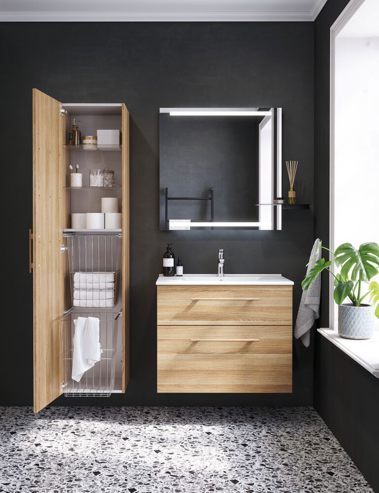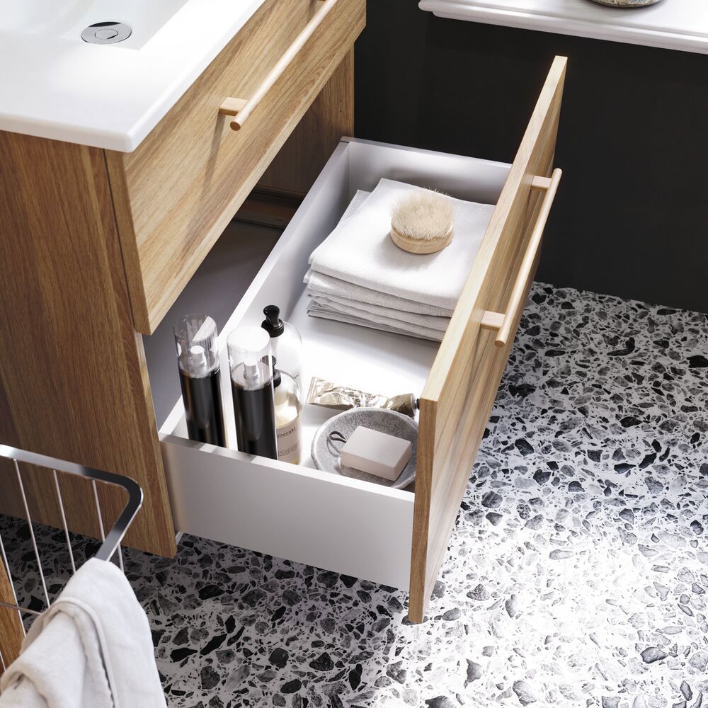 Ylellinen valinta niille, jotka haluavat lisätilaa ja muotoilua kylpyhuoneeseen. Tässä turhamaisuusyksikössä on kaksi suurta laatikkoa, jotka antavat sinulle runsaasti säilytystilaa ja yleiskuvaa. Laatikot vetäytyvät kokonaan ulos ja niissä on pehmeät, äänettömät liukukiskot, jotka korostavat kalusteiden korkeaa laatua. Ylimmässä laatikossa on älykäs leikkaus vesilukkoa varten, joten kaikki on valmiina asennusta varten. Toimiva kaluste kauniissa tanskalaisessa muotoilussa - rakennettu kestämään ja ilahduttamaan monta vuotta.