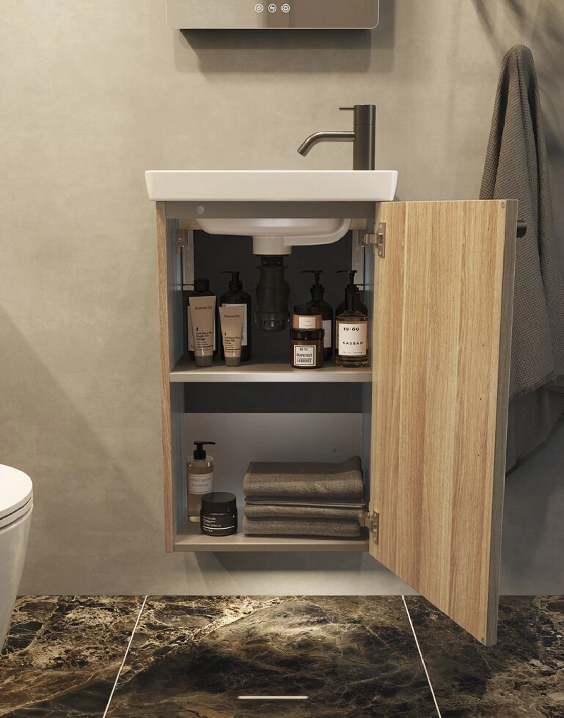 1-ovinen allaskaappi on ihanteellinen ratkaisu pieniin kylpyhuoneisiin. Vain 26 cm:n syvyydellä se vie vain vähän tilaa, mutta saat silti kaapin, jossa on käytännöllinen säilytystila. Tyylikäs muotoilu sopii täydellisesti mihin tahansa sisustukseen. Kaappi on sekä toimiva että esteettisesti miellyttävä, ja se auttaa luomaan järjestystä ja eleganssia kylpyhuoneeseesi. Päivitä tilasi allaskaapilla ja nauti älykkäästä tilaa säästävästä ratkaisusta. Huomautus: Valinnaisen värin sisältävistä tuotteista peritään käynnistysmaksu (BI1). Se maksetaan kerran valinnaisväriä kohden tuotteiden lukumäärästä riippumatta. Muista lisätä kylpyhuonekalusteisiisi pieniä käytännöllisiä asioita, joista nautit päivittäin. Esimerkiksi valot laatikoihin ja kaappeihin, sisäänrakennetut pistorasiat ja kalusteiden alla olevat himmennettävät tunnistinvalot, jotka ohjaavat yöllisiä kylpyhuonekäyntejä. Vaihtoehdot tilataan samaan aikaan kalusteiden kanssa.