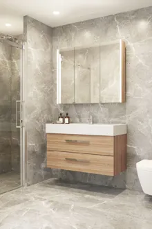 Kokeile sekä kaunista muotoilua että toiminnallisuutta Dansani Luna Ambi -peilikaapin kanssa. Peilikaapissa on runsaasti ylimääräistä säilytystilaa ja siinä on suurentava peili, metallihylly ja magneettikisko. Sisältä löydät myös kätevän pistorasian ja USB-pistokkeen, joita voit käyttää parranajokoneelle, föönille tai kun haluat ladata sähköhammasharjasi. Dansani Luna Ambi -peilikaappi on tietenkin saatavana kauniissa Luna-väreissä, joten saat kylpyhuoneesi kalusteisiin sopivan peilikaapin. Huomautus: Valinnaisen värin sisältävistä tuotteista peritään käynnistysmaksu (BI1). Se maksetaan kerran valinnaisväriä kohden tuotteiden lukumäärästä riippumatta.