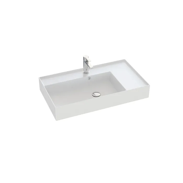 Vasemmanpuoleisesti sijoitettu Azym allas yhdistää elegantin, asymmetrisen muotoilun käytännölliseen toiminnallisuuteen. Allas on sijoitettu oikealle puolelle, mikä antaa runsaasti säilytystilaa vasemmalle puolelle — täydellinen tavaroidesi säilyttämiseen. Altaan hana ja viemäri ovat keskitetty, joten se sopii vaivattomasti kaikkiin kalusteisiimme. Suuren altaan ja käytännöllisen laskutilan ansiosta Azym on sekä toimiva että tyylikäs. Yläreuna estää veden roiskumisen altaan yli, pitäen kylpyhuoneen kuivana ja siistinä. Azym allas on ihanteellinen valinta niille, jotka etsivät modernia muotoilua, ja allas voidaan jopa kiinnittää seinään luoden minimalistisen ilmeen.