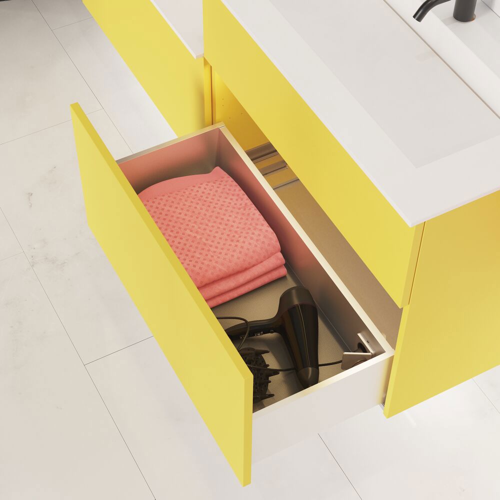 Luo kylpyhuoneestasi täydellinen keidas 1-laatikollisella kaapilla. Tämä monipuolinen kaappi täydentää allaskaappiasi täydellisesti, ja syvä laatikko tarjoaa runsaasti säilytystilaa hygieniatuotteillesi. Tällä kaapilla saat sekä toiminnallisuutta että estetiikkaa. Koe muodon ja toiminnallisuuden täydellinen yhdistelmä 1-laatikollisella kaapilla ja luo järjestetty ilmapiiri, joka huokuu eleganssia. Huomautus: Valinnaisen värin sisältävistä tuotteista peritään käynnistysmaksu (BI1). Se maksetaan kerran valinnaisväriä kohden tuotteiden lukumäärästä riippumatta. Muista lisätä kylpyhuonekalusteisiisi pieniä käytännöllisiä asioita, joista nautit päivittäin. Esimerkiksi valot laatikoihin ja kaappeihin, sisäänrakennetut pistorasiat ja kalusteiden alla olevat himmennettävät tunnistinvalot, jotka ohjaavat yöllisiä kylpyhuonekäyntejä. Vaihtoehdot tilataan samaan aikaan kalusteiden kanssa.