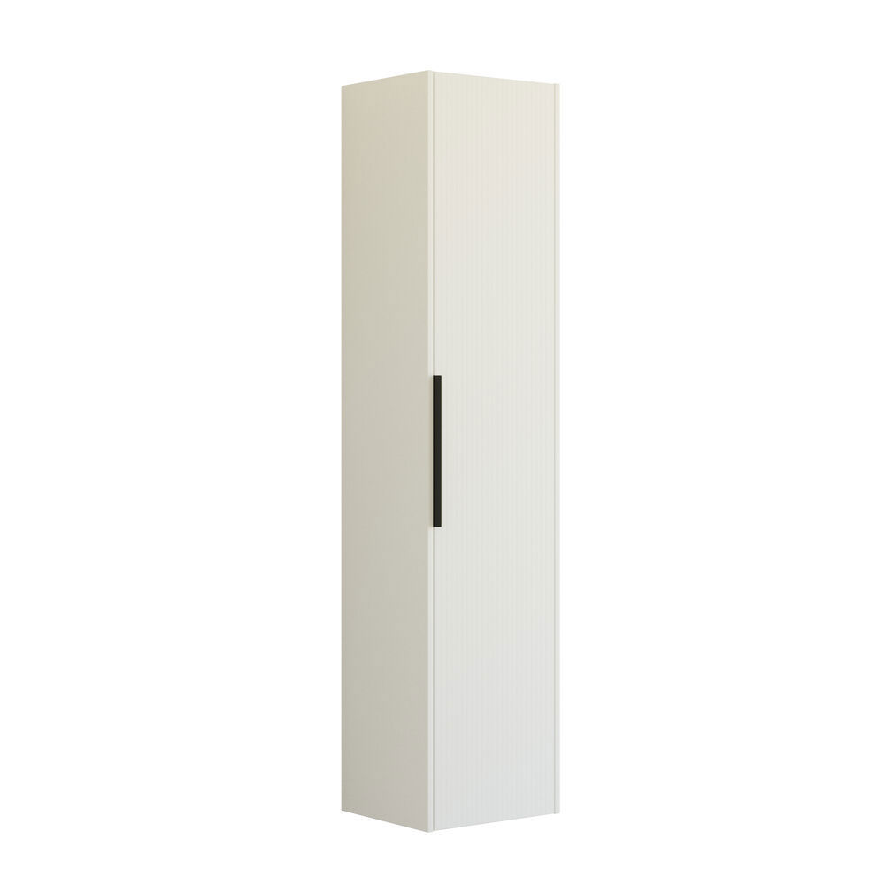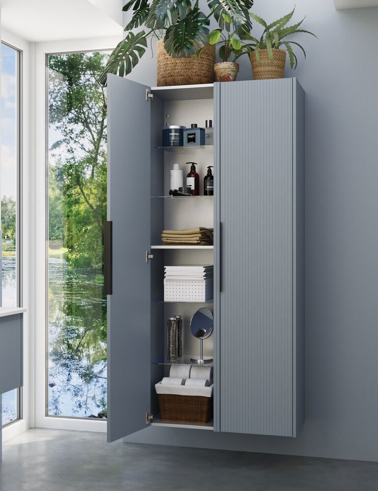 Tämässä korkeassa kaapissa yhdistyvät käännettävän oven joustavuus ja tyylikäs raidallinen etuosa, joka tuo modernin lisän kylpyhuoneeseesi. Sisällä on puuhylly ja 4 lasihyllyä, jotka tarjoavat runsaasti tilaa hygieniatuotteiden järjestämiseen. Kaappi on saatavana valkoisena, hiekanvärisenä tai vaaleansinisenä, ja asennetun kahvan ansiosta kaappi on heti käyttövalmis.