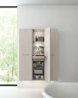 Kylpyhuoneen säilytyksestä tulee yksinkertaista ja tyylikästä Dansani Calidris -korkeilla kaapeilla. Nämä kaapit eivät ole vain toiminnallinen elementti, vaan myös esteettinen nautinto, joka sopii täydellisesti moderniin kylpyhuoneen sisustukseen. Älykkäiden hyllyjen ja lokeroiden ansiosta Calidris-korkeissa kaapeissa voit järjestellä kaiken pyyhkeistä ja hygieniatuotteista kauneustuotteisiin järjestelmällisesti. Korkeiden kaappien tyylikäs muotoilu ja selkeät linjat tuovat järjestyksen ja harmonian tunnetta kylpyhuoneen ympäristöön. Huomautus: Tammella ja valinnaisella värillä varustetuista tuotteista peritään käynnistysmaksu (BI1). Maksetaan kerran tammea ja valinnaista väriä kohti tuotteiden lukumäärästä riippumatta. Muista lisätä kylpyhuonekalusteisiisi pieniä käytännöllisiä asioita, joista nautit päivittäin. Esimerkiksi valot laatikoihin ja kaappeihin, sisäänrakennetut pistorasiat ja kalusteiden alla olevat himmennettävät tunnistinvalot, jotka ohjaavat yöllisiä kylpyhuonekäyntejä. Vaihtoehdot tilataan samaan aikaan kalusteiden kanssa.