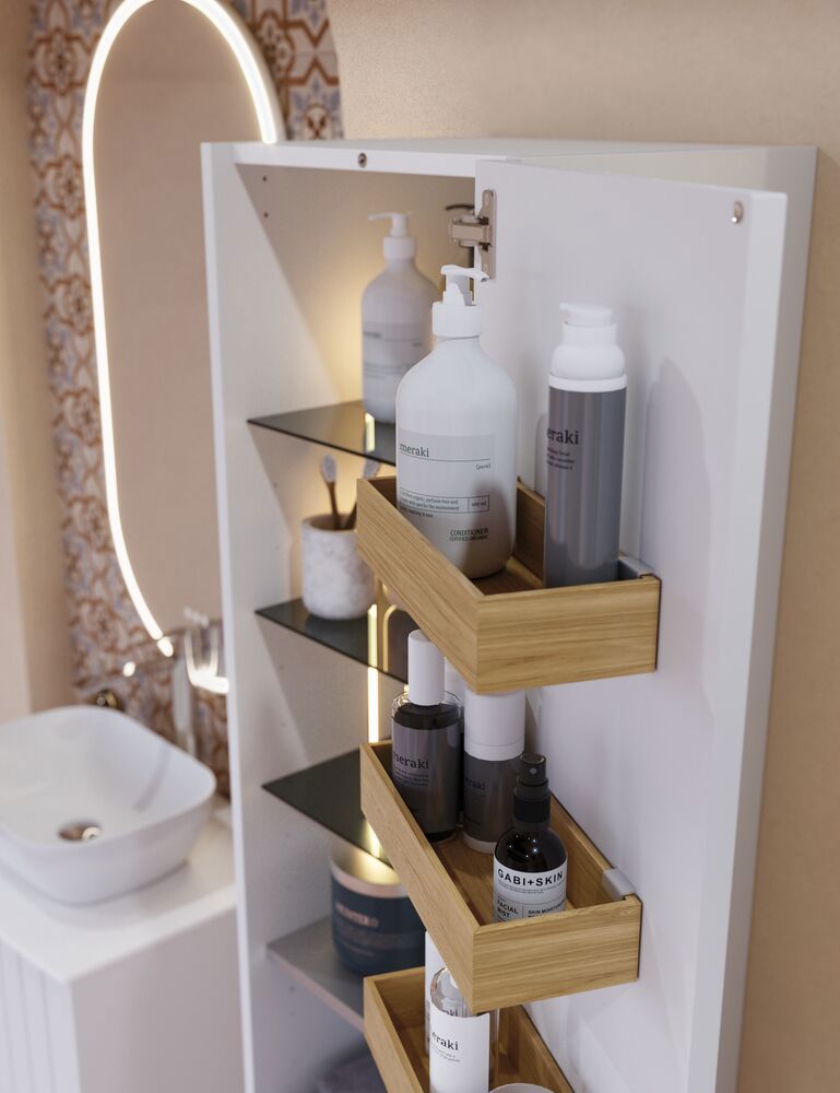 Luo kylpyhuoneeseesi viihtyisä ilmapiiri tällä korkealla kaapilla, jossa on uritettu etuosa, versio B. Tässä 176 cm korkeassa kaapissa on yksi puuhylly, kolme lyhennettyä lasihyllyä, kolme puista lokeroa ovessa ja kaksi lasihyllyä. Tilavan säilytystilan ansiosta kaikki on käden ulottuvilla, ja uritetut yksityiskohdat tuovat sisustukseen klassisen lisän. Korkea kaappi sopii erinomaisesti hygieniatuotteiden, pyyhkeiden ja muiden välttämättömien tavaroiden säilytykseen, ja sen tyylikäs muotoilu tekee siitä esteettisen osan kylpyhuoneestasi. Huomautus: Valinnaisen värin sisältävistä tuotteista peritään käynnistysmaksu (BI1). Se maksetaan kerran valinnaisväriä kohden tuotteiden lukumäärästä riippumatta. Muista lisätä kylpyhuonekalusteisiisi pieniä käytännöllisiä asioita, joista nautit päivittäin. Esimerkiksi valot laatikoihin ja kaappeihin, sisäänrakennetut pistorasiat ja kalusteiden alla olevat himmennettävät tunnistinvalot, jotka ohjaavat yöllisiä kylpyhuonekäyntejä. Vaihtoehdot tilataan samaan aikaan kalusteiden kanssa.
