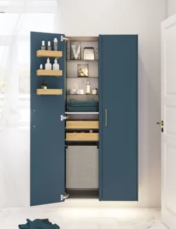 Valitse korkea kaappi sileällä etuosalla versiossa C saadaksesi täydellisen säilytysratkaisun. Kaapissa on yksi puuhylly, kolme lyhennettyä lasihyllyä, kolme puulokeroa oven sisäpuolella, kaksi ulosvedettävää laatikkoa ja pyykkipussi. Tämä kokonaisuus on ihanteellinen kylpyhuoneen siistinä pitämiseen, jolloin löydät päivittäiset tarvikkeesi helposti. Sileä pinta ja tyylikäs muotoilu tekevät siitä kylpyhuoneesi keskipisteen, joka on sekä toiminnallinen että visuaalisesti miellyttävä. Huomautus: Valinnaisen värin sisältävistä tuotteista peritään käynnistysmaksu (BI1). Se maksetaan kerran valinnaisväriä kohden tuotteiden lukumäärästä riippumatta. Muista lisätä kylpyhuonekalusteisiisi pieniä käytännöllisiä asioita, joista nautit päivittäin. Esimerkiksi valot laatikoihin ja kaappeihin, sisäänrakennetut pistorasiat ja kalusteiden alla olevat himmennettävät tunnistinvalot, jotka ohjaavat yöllisiä kylpyhuonekäyntejä. Vaihtoehdot tilataan samaan aikaan kalusteiden kanssa.