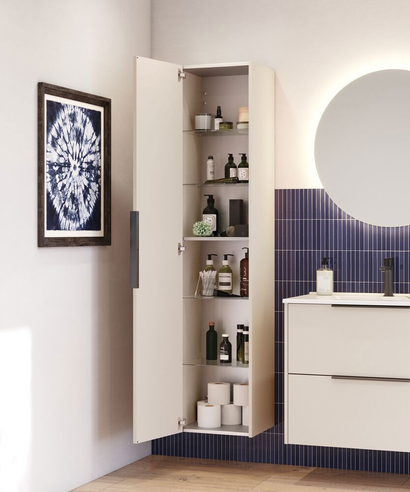 Tämä korkea kaappi on suunniteltu joustavaksi ja tilavaksi. Käännettävän oven ansiosta voit mukauttaa kaapin sisustukseen, olipa suunta mikä tahansa. Sisältä löydät tukevan puuhyllyn ja 4 irrotettavaa lasihyllyä, jotka antavat sinulle runsaasti säilytysmahdollisuuksia. Kaappi on saatavana valkoisena, hiekanvärisenä tai vaaleansinisenä, ja kahva on asennettu, joten kaappi on käyttövalmis.