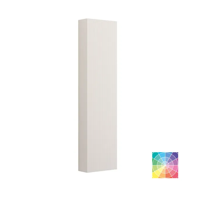 Korkea kaappi, jossa on 1 ovi, rimaura, saranat oikealla