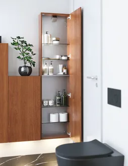 Onko sinulla kylpyhuone, jossa on vähän tilaa ja tarvitset säilytystilaa? Silloin tämä Dansani Calidris -malliston korkea kaappi on ratkaisu sinulle. Korkea kaappi on vain 16 cm syvä, mutta siinä on silti runsaasti tilaa kylpyhuoneen tavaroiden säilyttämiseen ja järjestämiseen. Korkea kaappi on huomaamaton mutta toimiva ratkaisu, jonka avulla voit säilyttää kylpyhuonetarvikkeita, pitää asiat järjestyksessä ja vapauttaa tilaa. Huomautus: Tammella ja valinnaisella värillä varustetuista tuotteista peritään käynnistysmaksu (BI1). Maksetaan kerran tammea ja valinnaista väriä kohti tuotteiden lukumäärästä riippumatta. Muista lisätä kylpyhuonekalusteisiisi pieniä käytännöllisiä asioita, joista nautit päivittäin. Esimerkiksi valot laatikoihin ja kaappeihin, sisäänrakennetut pistorasiat ja kalusteiden alla olevat himmennettävät tunnistinvalot, jotka ohjaavat yöllisiä kylpyhuonekäyntejä. Vaihtoehdot tilataan samaan aikaan kalusteiden kanssa.