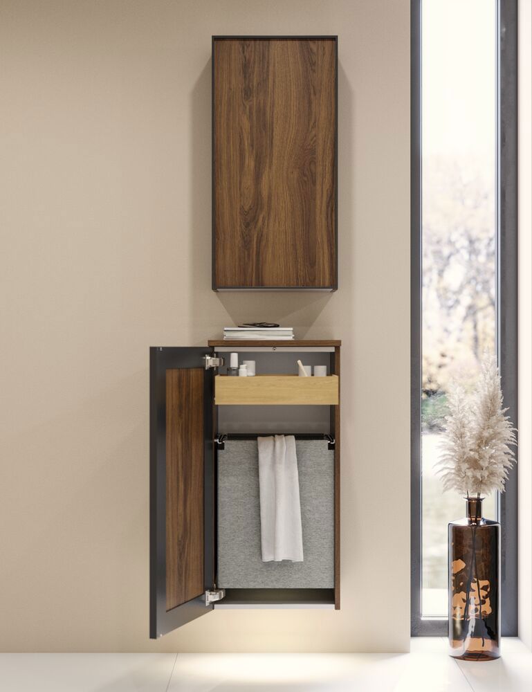 Musta kehys puolikaapissa Versio B tarjoaa toimivan ja tyylikkään ratkaisun kylpyhuoneeseesi. Leveys on 40 cm ja syvyys 35 cm, ja tämä puolikaappi on varustettu ulosvedettävällä laatikolla ja pyykkipussilla, mikä tekee siitä ihanteellisen sekä kosmetiikan että pyykin säilyttämiseen. Musta kehys lisää modernia ilmettä kylpyhuoneeseesi, kun taas käytännöllinen muotoilu varmistaa, että kaikki pysyy järjestyksessä ja helposti saatavilla. Tämän puolikaapin avulla voit optimoida säilytystilasi ja luoda siistin ympäristön, jossa löydät helposti kaiken tarvitsemasi. Huomautus: Valinnaisen värin sisältävistä tuotteista peritään käynnistysmaksu (BI1). Se maksetaan kerran valinnaisväriä kohden tuotteiden lukumäärästä riippumatta. Muista lisätä kylpyhuonekalusteisiisi pieniä käytännöllisiä asioita, joista nautit päivittäin. Esimerkiksi valot laatikoihin ja kaappeihin, sisäänrakennetut pistorasiat ja kalusteiden alla olevat himmennettävät tunnistinvalot, jotka ohjaavat yöllisiä kylpyhuonekäyntejä. Vaihtoehdot tilataan samaan aikaan kalusteiden kanssa.