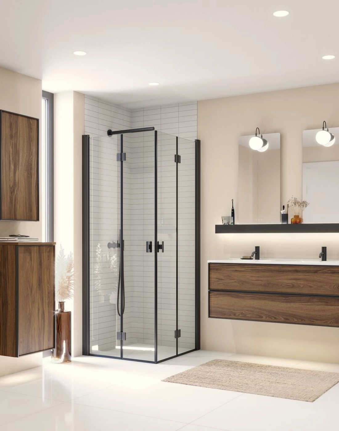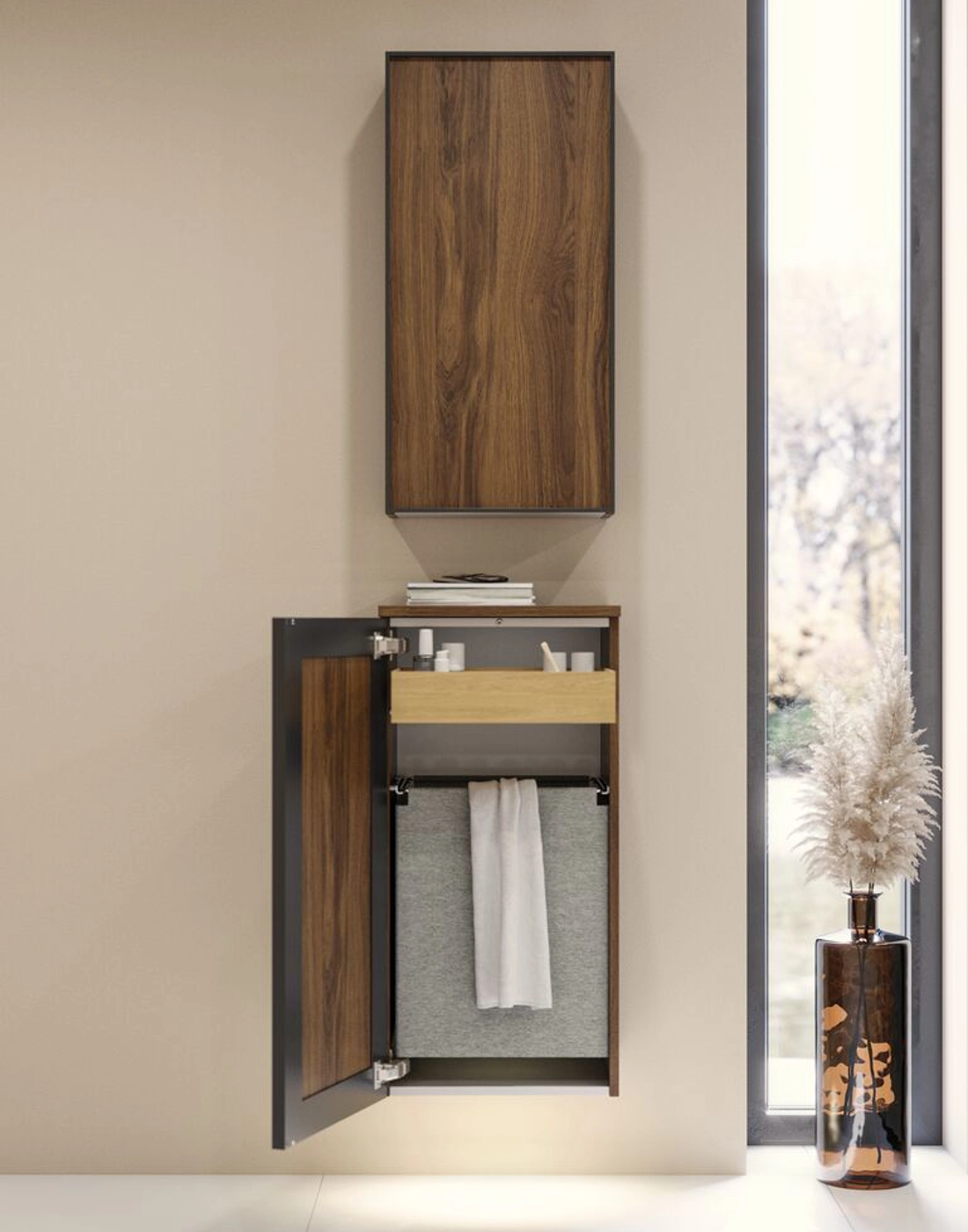 Musta kehys puolikaapissa Versio B tarjoaa toimivan ja tyylikkään ratkaisun kylpyhuoneeseesi. Leveys on 40 cm ja syvyys 35 cm, ja tämä puolikaappi on varustettu ulosvedettävällä laatikolla ja pyykkipussilla, mikä tekee siitä ihanteellisen sekä kosmetiikan että pyykin säilyttämiseen. Musta kehys lisää modernia ilmettä kylpyhuoneeseesi, kun taas käytännöllinen muotoilu varmistaa, että kaikki pysyy järjestyksessä ja helposti saatavilla. Tämän puolikaapin avulla voit optimoida säilytystilasi ja luoda siistin ympäristön, jossa löydät helposti kaiken tarvitsemasi. Huomautus: Valinnaisen värin sisältävistä tuotteista peritään käynnistysmaksu (BI1). Se maksetaan kerran valinnaisväriä kohden tuotteiden lukumäärästä riippumatta. Muista lisätä kylpyhuonekalusteisiisi pieniä käytännöllisiä asioita, joista nautit päivittäin. Esimerkiksi valot laatikoihin ja kaappeihin, sisäänrakennetut pistorasiat ja kalusteiden alla olevat himmennettävät tunnistinvalot, jotka ohjaavat yöllisiä kylpyhuonekäyntejä. Vaihtoehdot tilataan samaan aikaan kalusteiden kanssa.