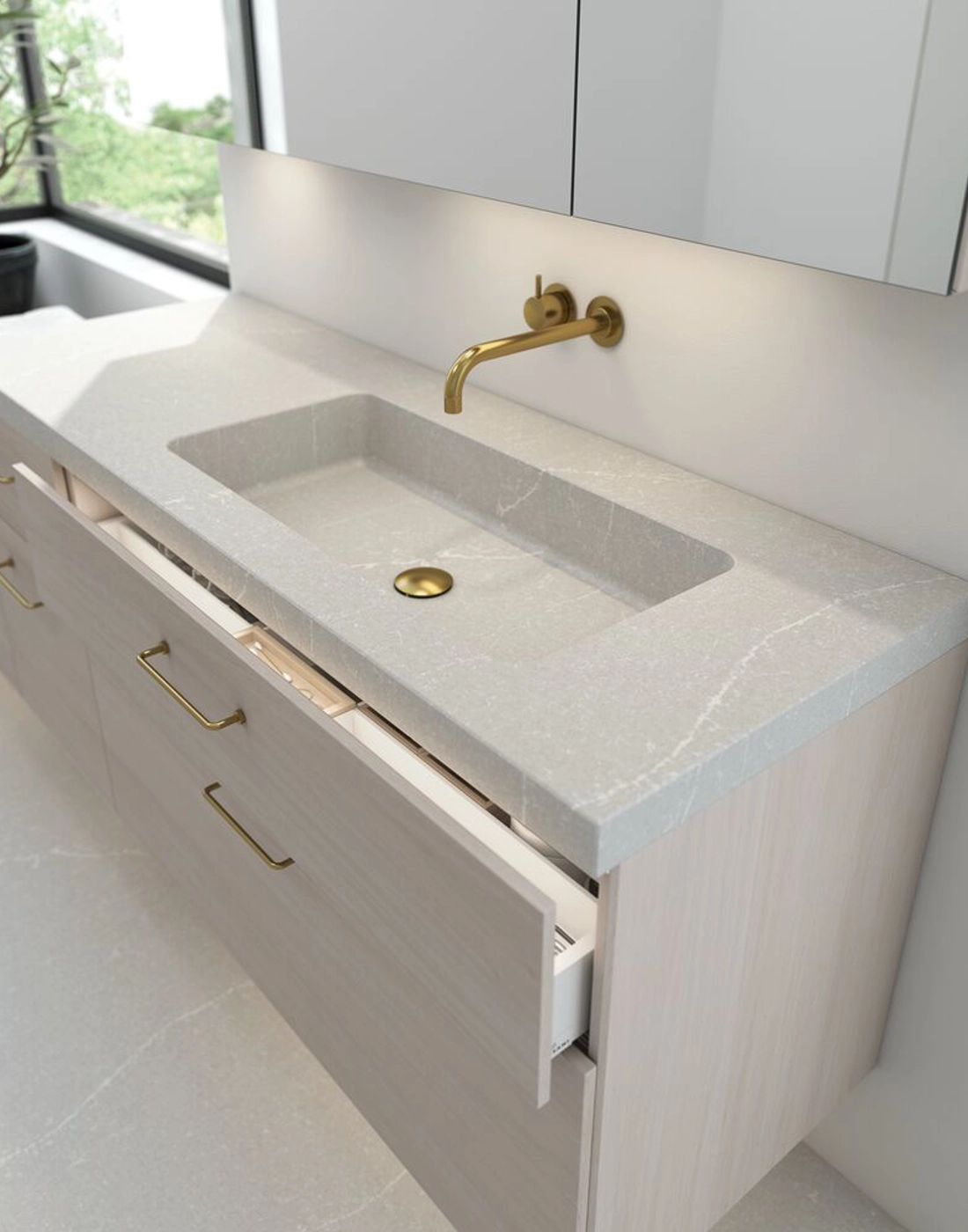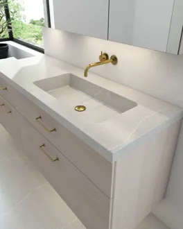 Silestonesta valmistettu Dansani Calidris Unique -työtaso on vaikuttava yhdistelmä estetiikkaa ja kestävyyttä, joka muuttaa kylpyhuoneesi. Sen lisäksi, että tämä työtaso on kaunis katsella, se on valmistettu kovaa kulutusta kestävästä Silestone-materiaalista, joka kestää päivittäistä käyttöä ja säilyttää kauneutensa. Työtasoa on saatavana yksilöllisinä kokoina, joten voit räätälöidä työtason juuri sinun tarpeisiisi ja kylpyhuoneeseesi sopivaksi. Pöytälevyn väri voi poiketa esitetystä kuvasta, joten suosittelemme, että näet fyysisen näytteen jälleenmyyjällä ennen ostamista.