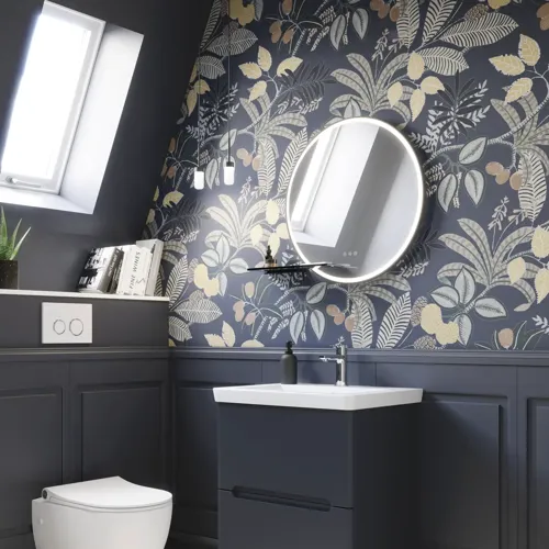 - Pienempiin kylpyhuoneisiin - tässä tapauksessa 60 cm:n pyöreä peili on tilaa säästävä valinta, joka lisää syvyyttä ja tekee huoneesta tilavamman.