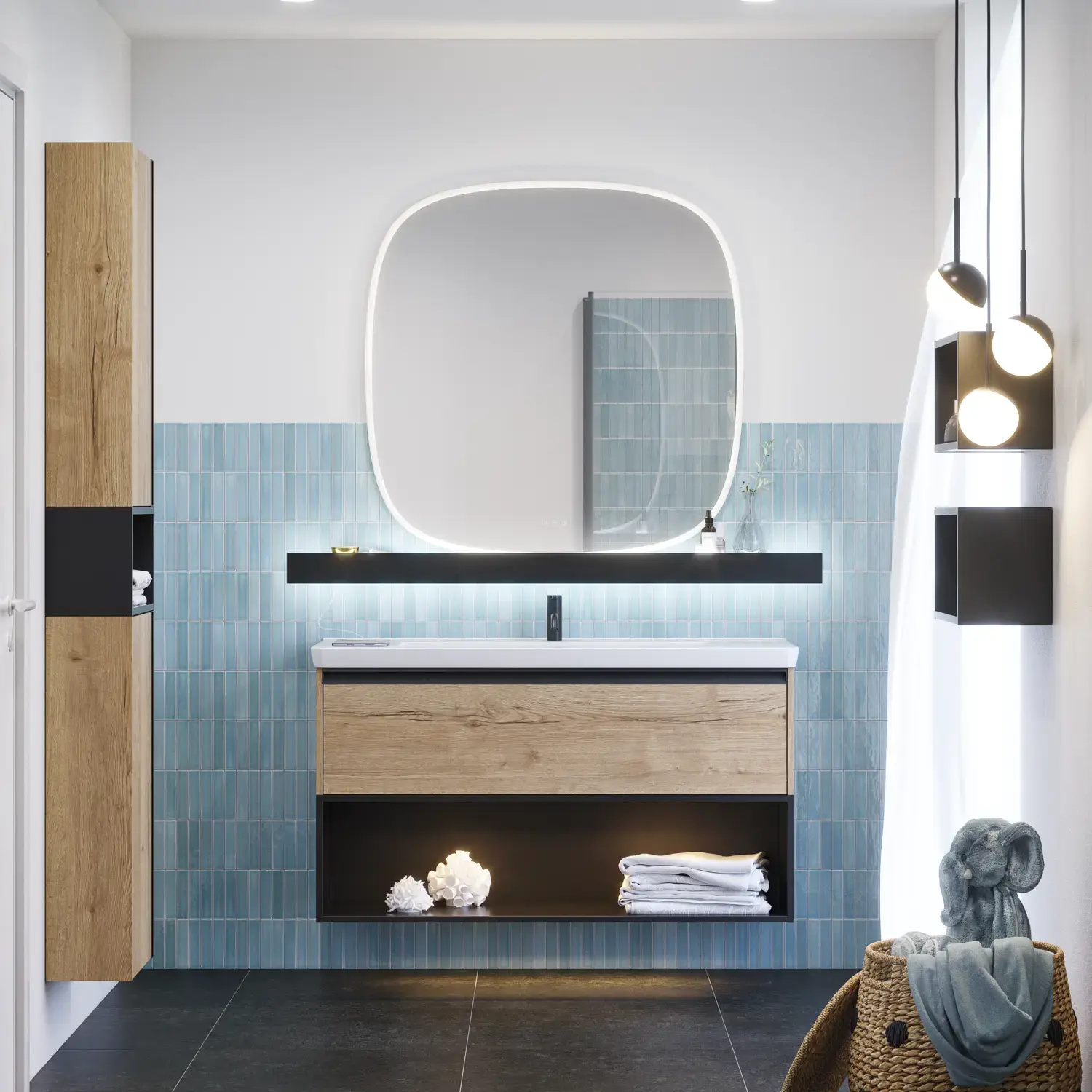 100 cm:n kylpyhuoneen peilissä yhdistyvät tilavuus, tyyli ja toiminnallisuus. Se tarjoaa tyylikkään ja harmonisen ilmeen ja takaa samalla optimaalisen peilitilan - täydellinen niille, jotka haluavat kylpyhuoneen, jossa sekä muotoilu että mukavuus ovat keskiössä.