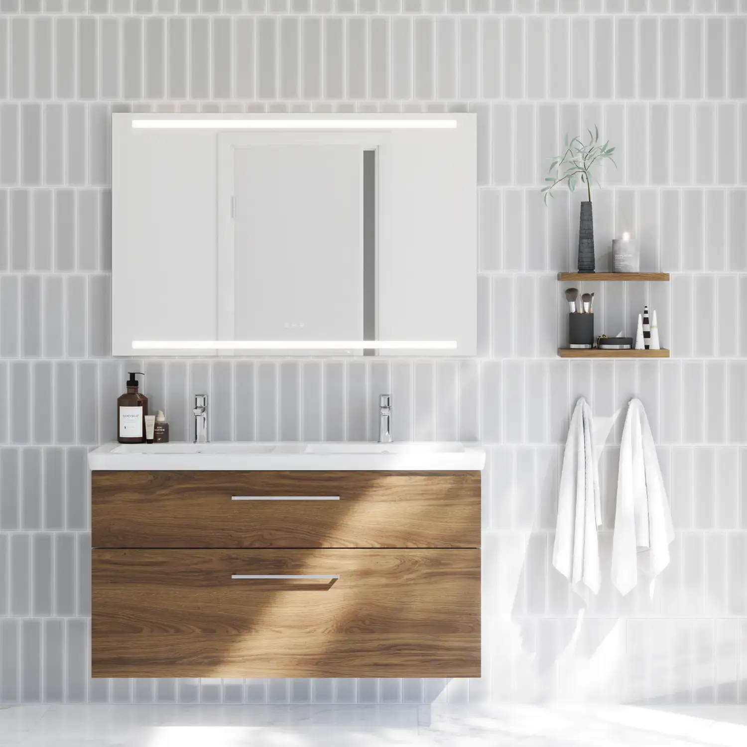 Bij Dansani bieden we twee geselecteerde spiegels van 160 cm breed, beide ontworpen met slimme functies en een elegante look. Welke u ook kiest, u krijgt ingebouwde lichtregeling, zodat u de lichtintensiteit en kleurtemperatuur precies naar wens kunt aanpassen - van helder werklicht in de ochtend tot zachter en sfeervoller licht in de avond.