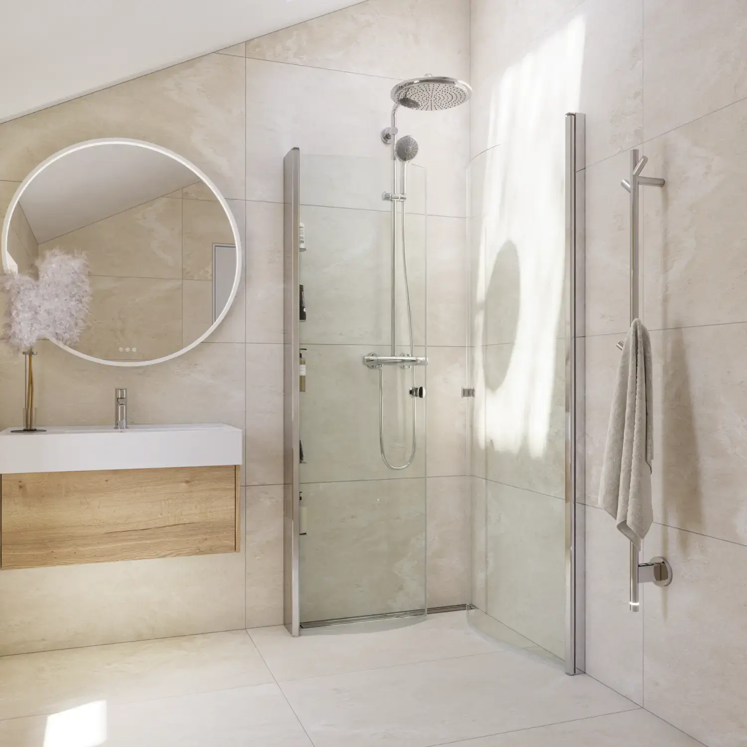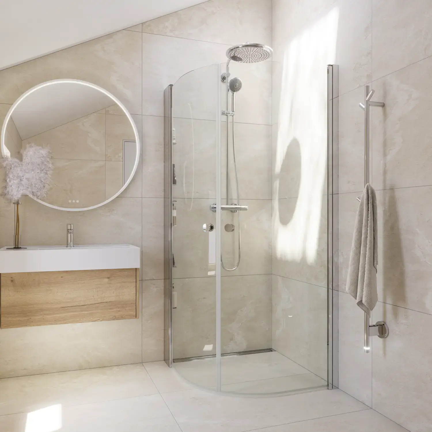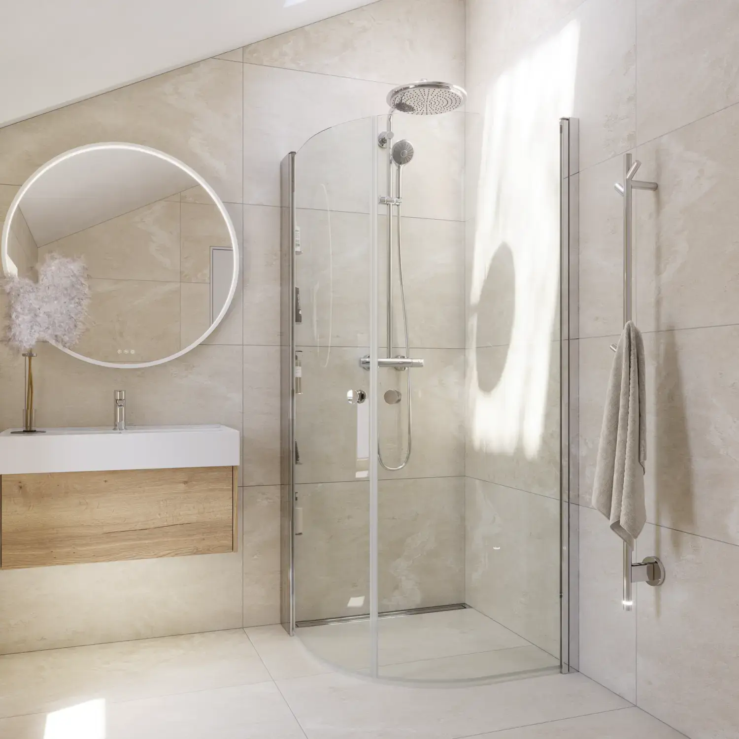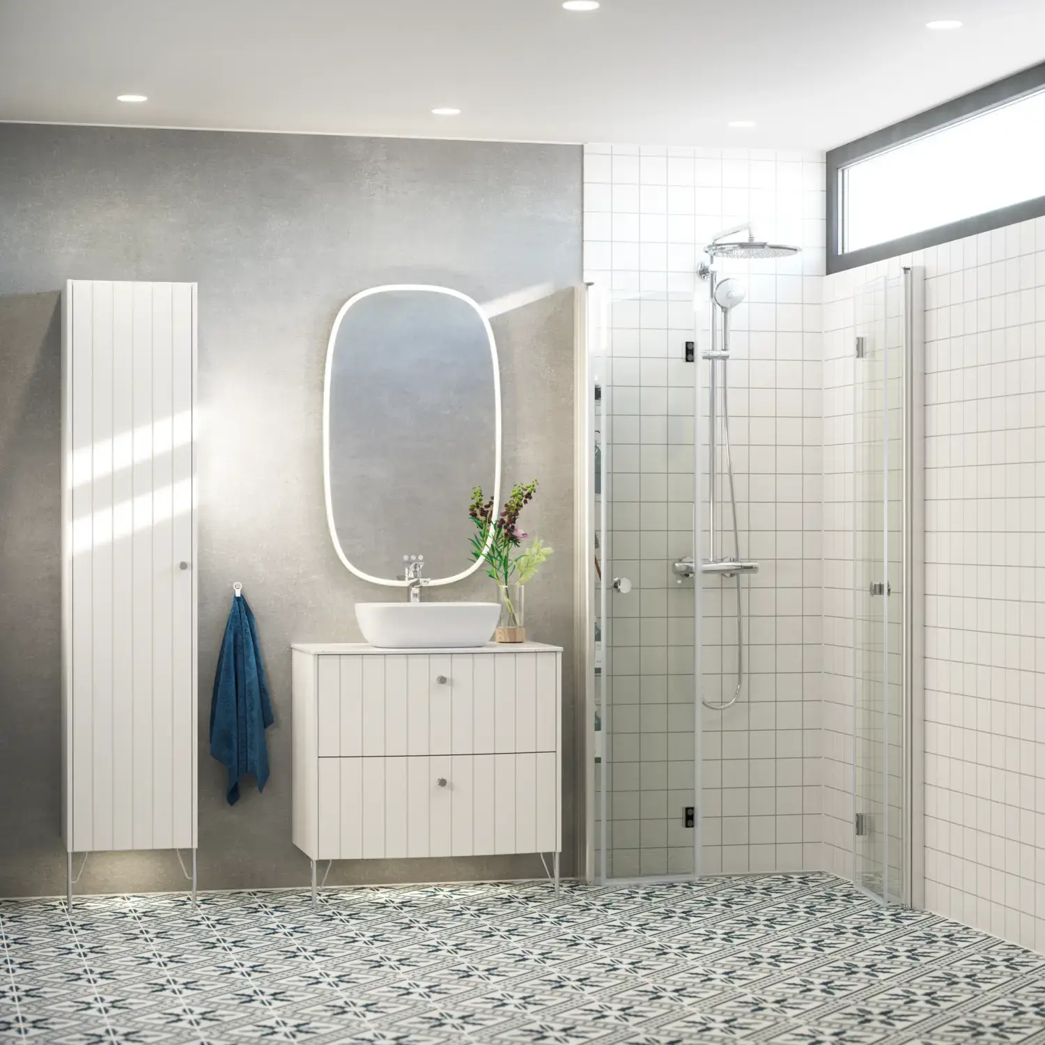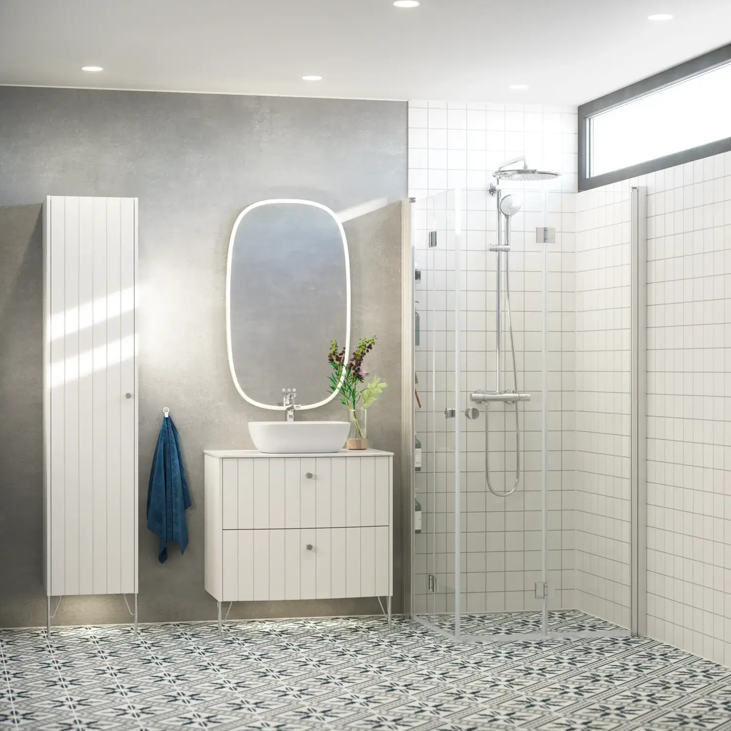 Dansani Match-sarjan kahdella kaarevalla ovella voit muodostaa suihkunurkkauksen. Molempiin suuntiin avautuvat ovet tuovat paljon lisätilaa, kun suihku ei ole käytössä.