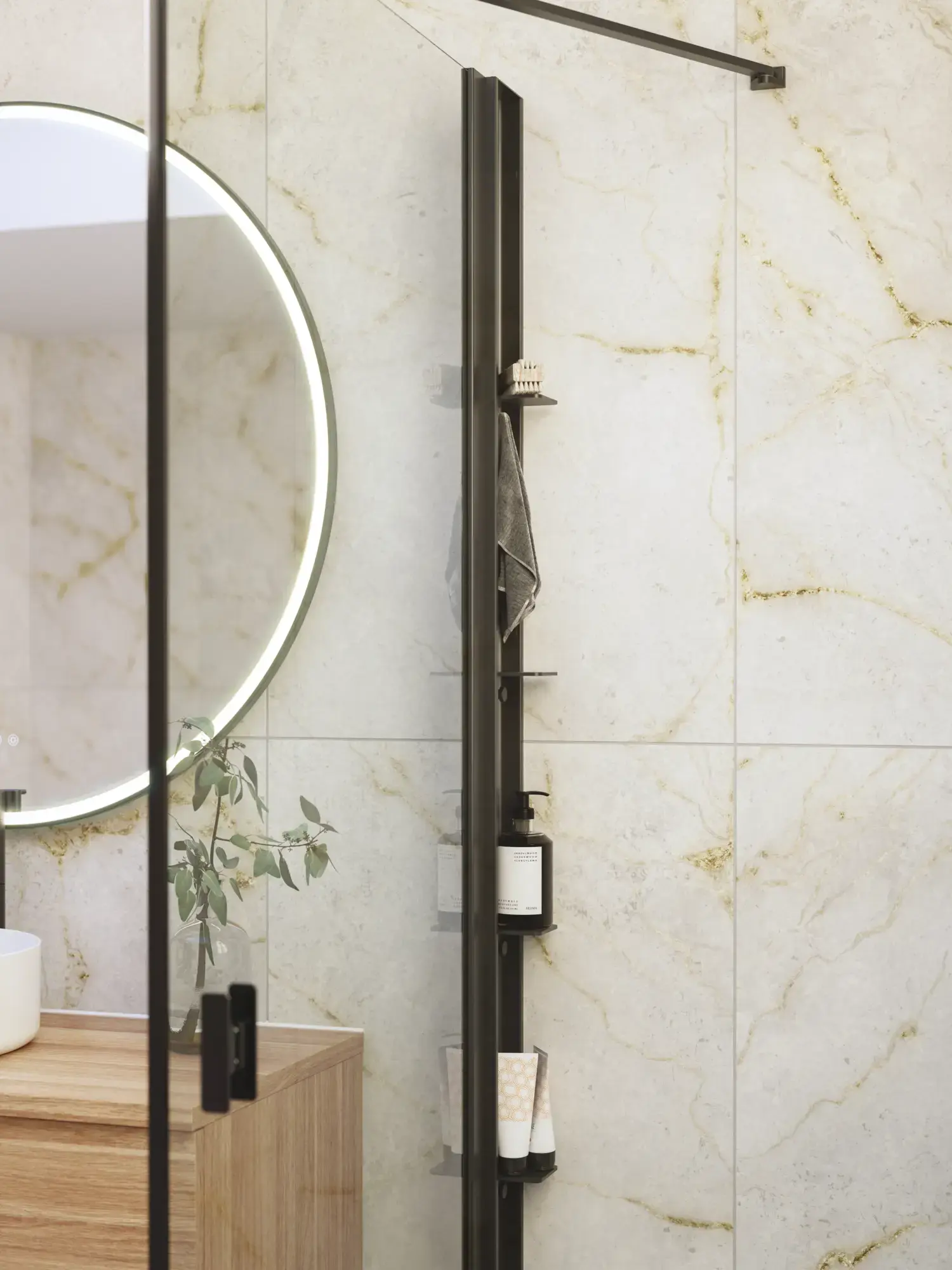 Epäjärjestys kylpyhuoneessa tai suihkualueella ei ole mukavaa. Tower-kulmahyllyssä, joka on integroitu Match-sarjan osa, on tilat shampoolle, saippualle ja muille peseytymistarvikkeille. Tower on saatavilla musta- ja satiinipintaisena.