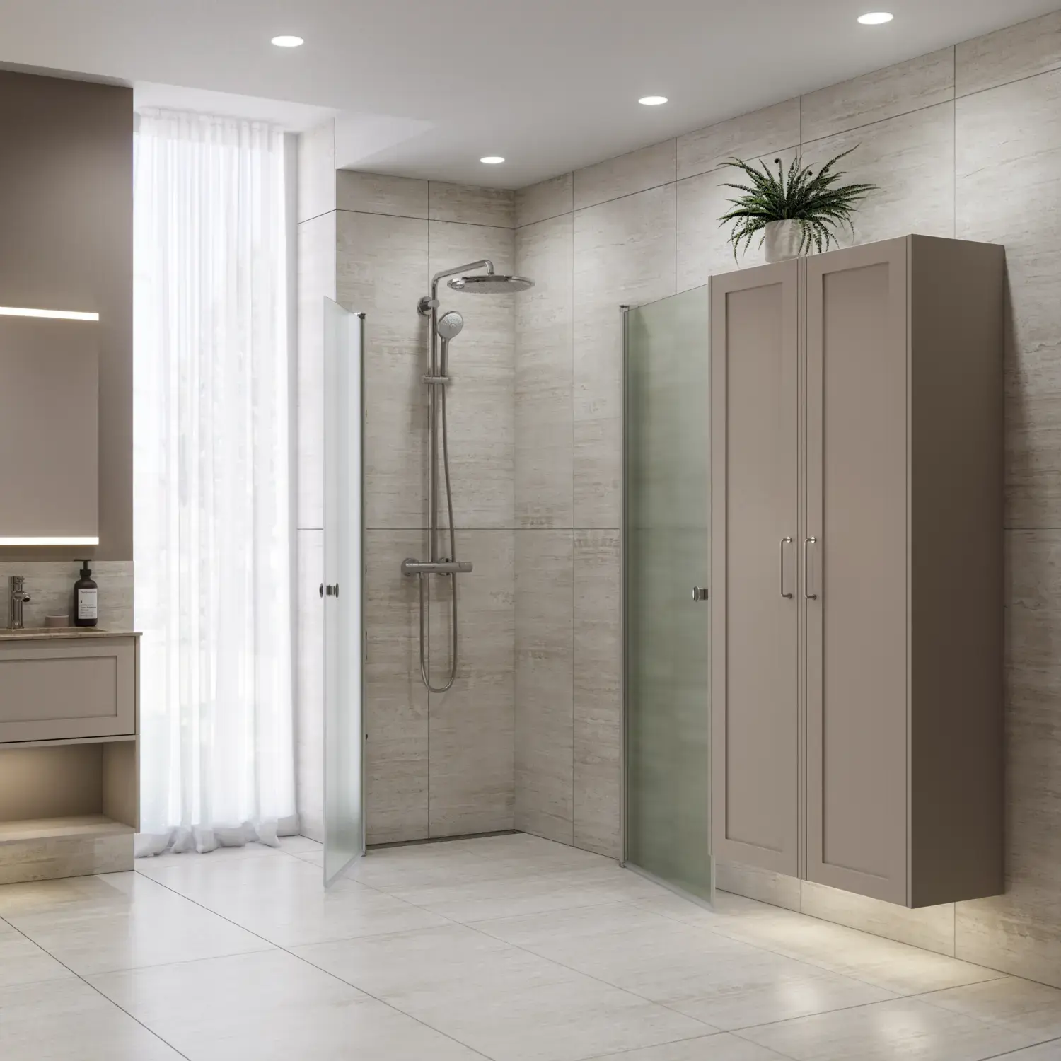 Pienen kylpyhuoneen suihkunurkan vieressä olevan tilan voi hyödyntää valitsemalla levikepaneelin ja oven yhdistelmän. Dansani Match suihkuovet kääntyvät sisäänpäin säästäen tilaa.