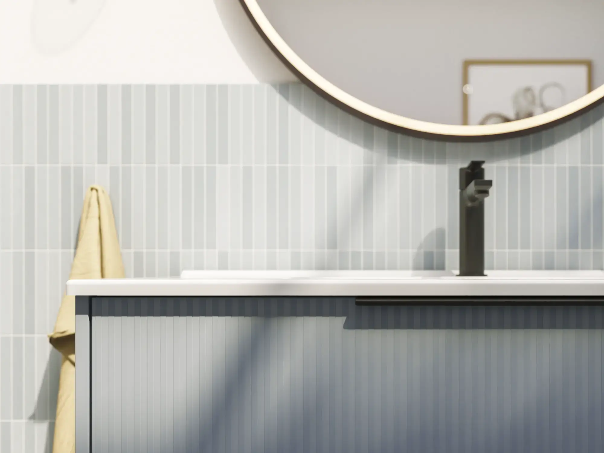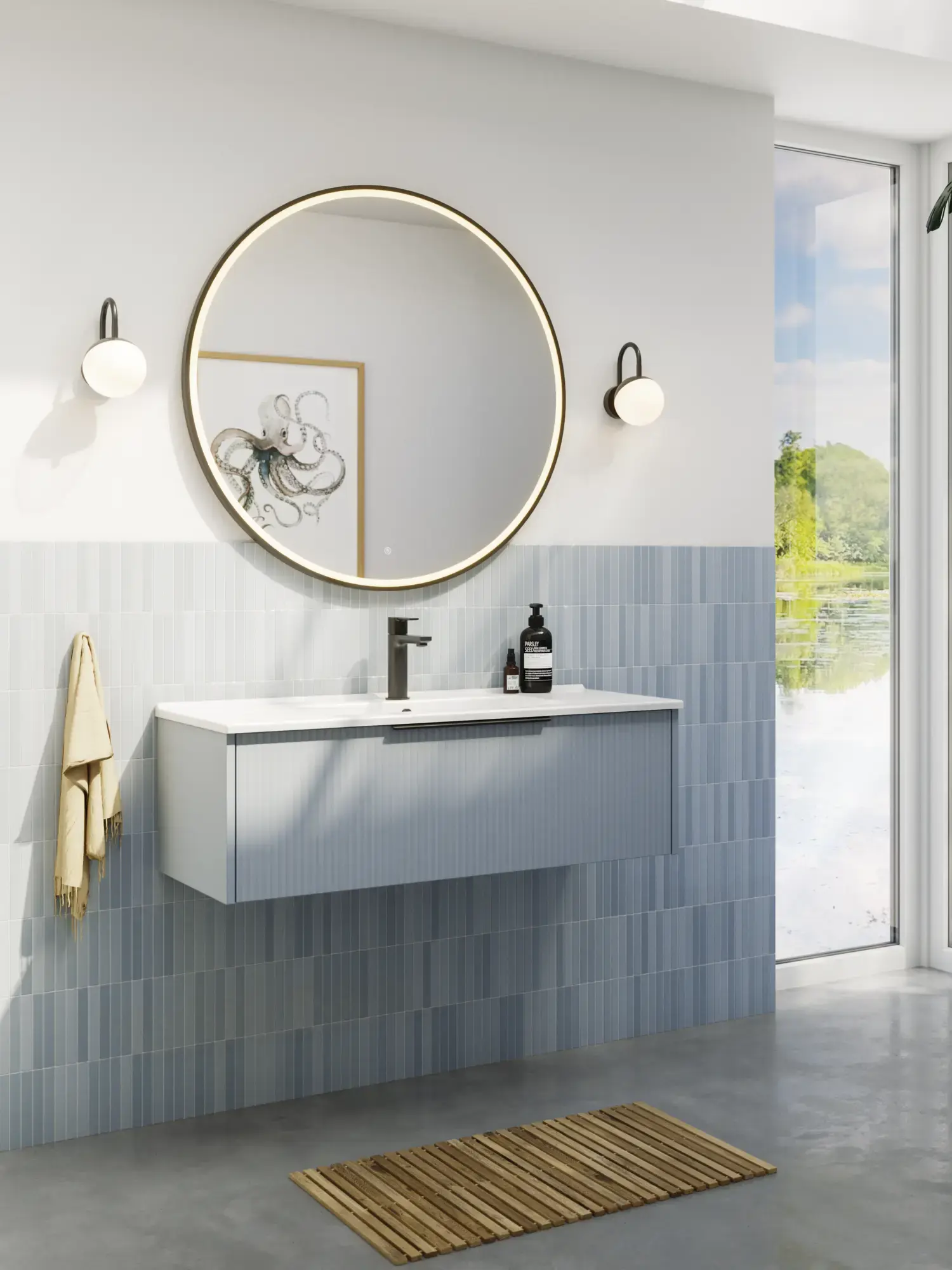 Kapean valaisimen, Select-peilin kehyksen ja turhamaisuuskaapin ohuiden mustien kahvojen yhdistelmä yhdistää tyylikkään ilmeen.