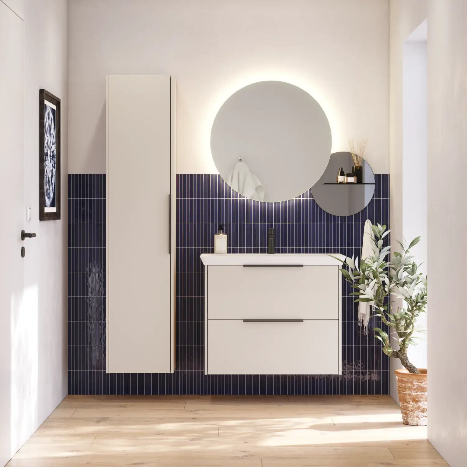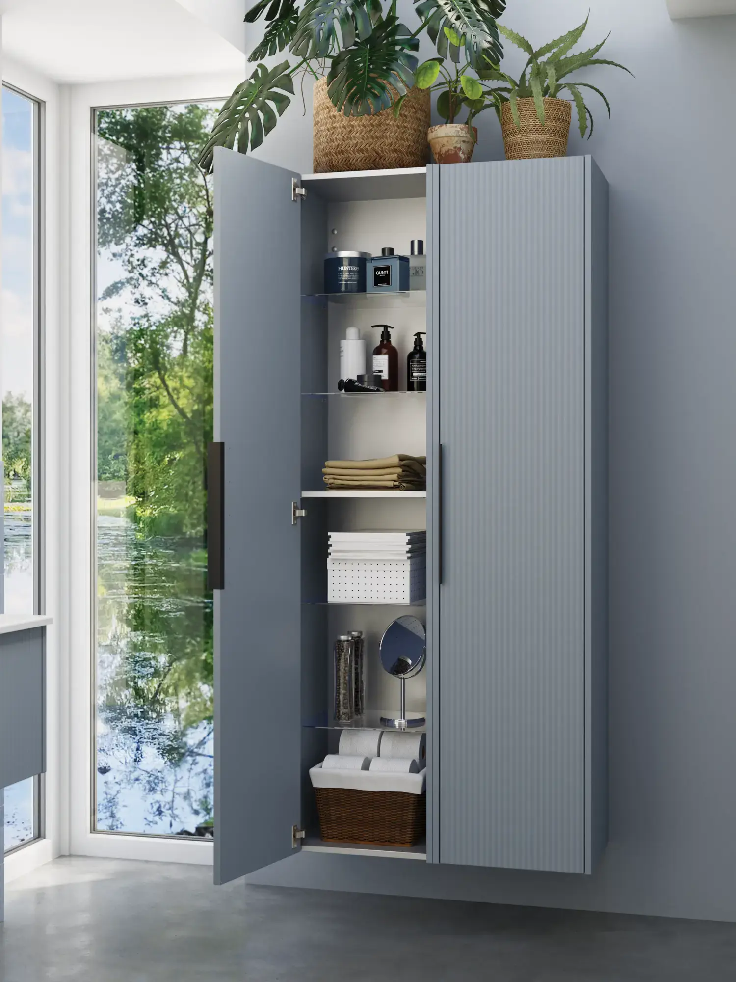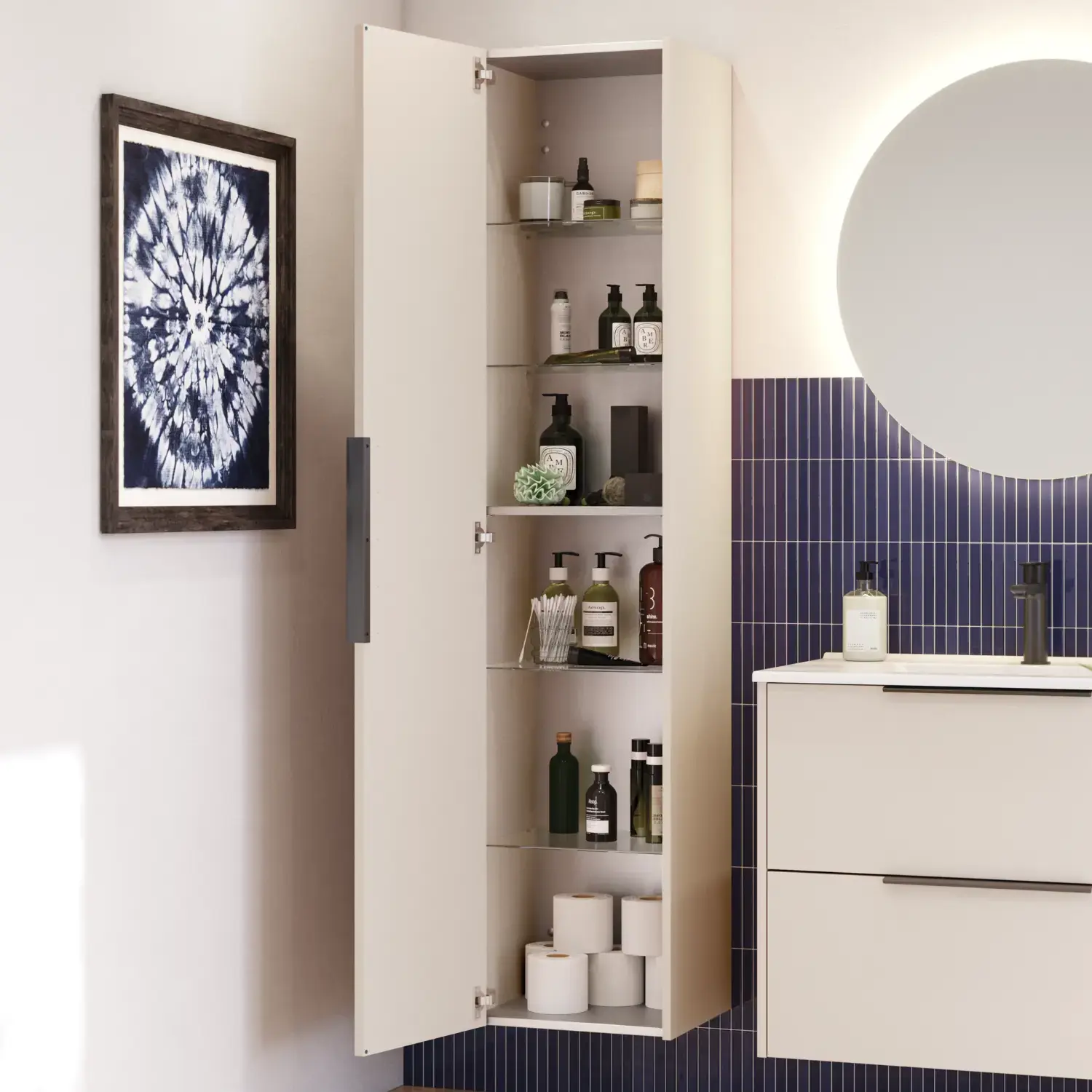Mido Classic vaalea hiekanväri tekee kylpyhuoneesta lämpimän ja kutsuvan. Hyödynnä laatikoita suurille ja pienille tavaroille - tilaa on runsaasti. Muokkaa korkea kaappi sopivaksi kaikille pulloille ja pyyhkeille käytännöllisillä 4 irrotettavalla lasihyllyllä.