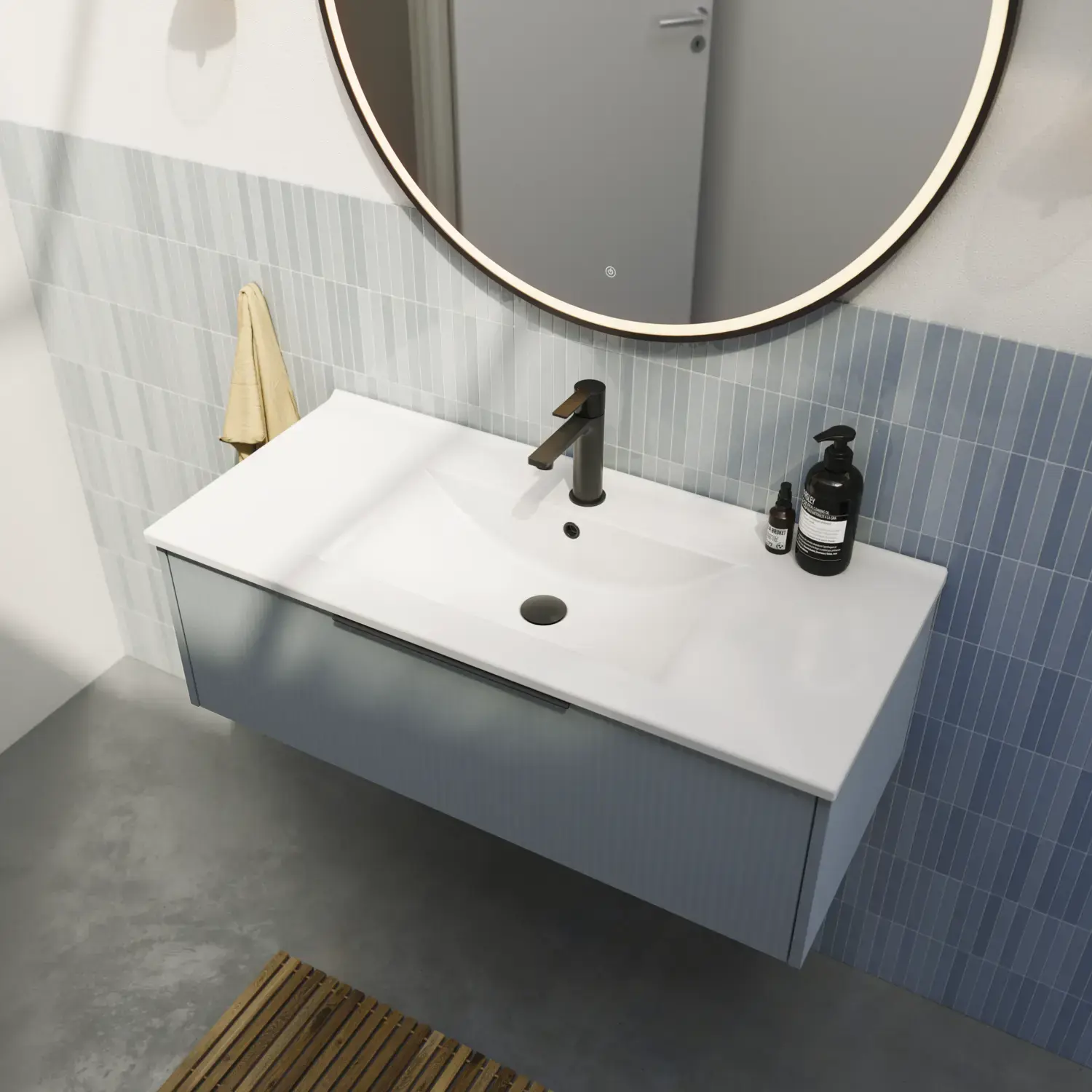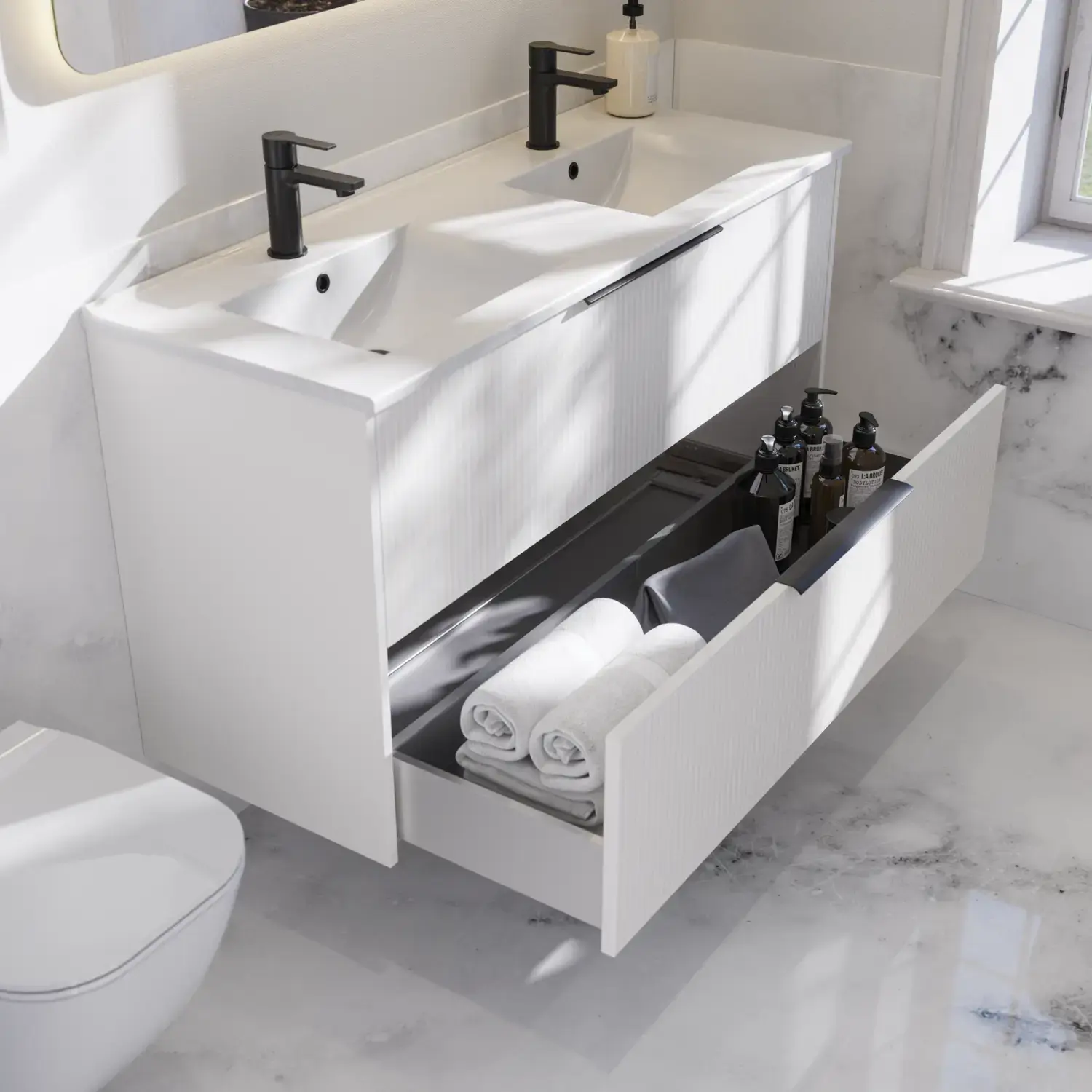 Raidalliset etulevyt antavat klassiselle valkoiselle kylpyhuoneelle mukavan vivahteen ja korostavat pohjoismaista ilmettä. Laatikoissa on luonnollisesti runsaasti tilaa, ja ne voidaan vetää kokonaan ulos, jotta sinulla on yleiskuva kaikesta sisällöstä.